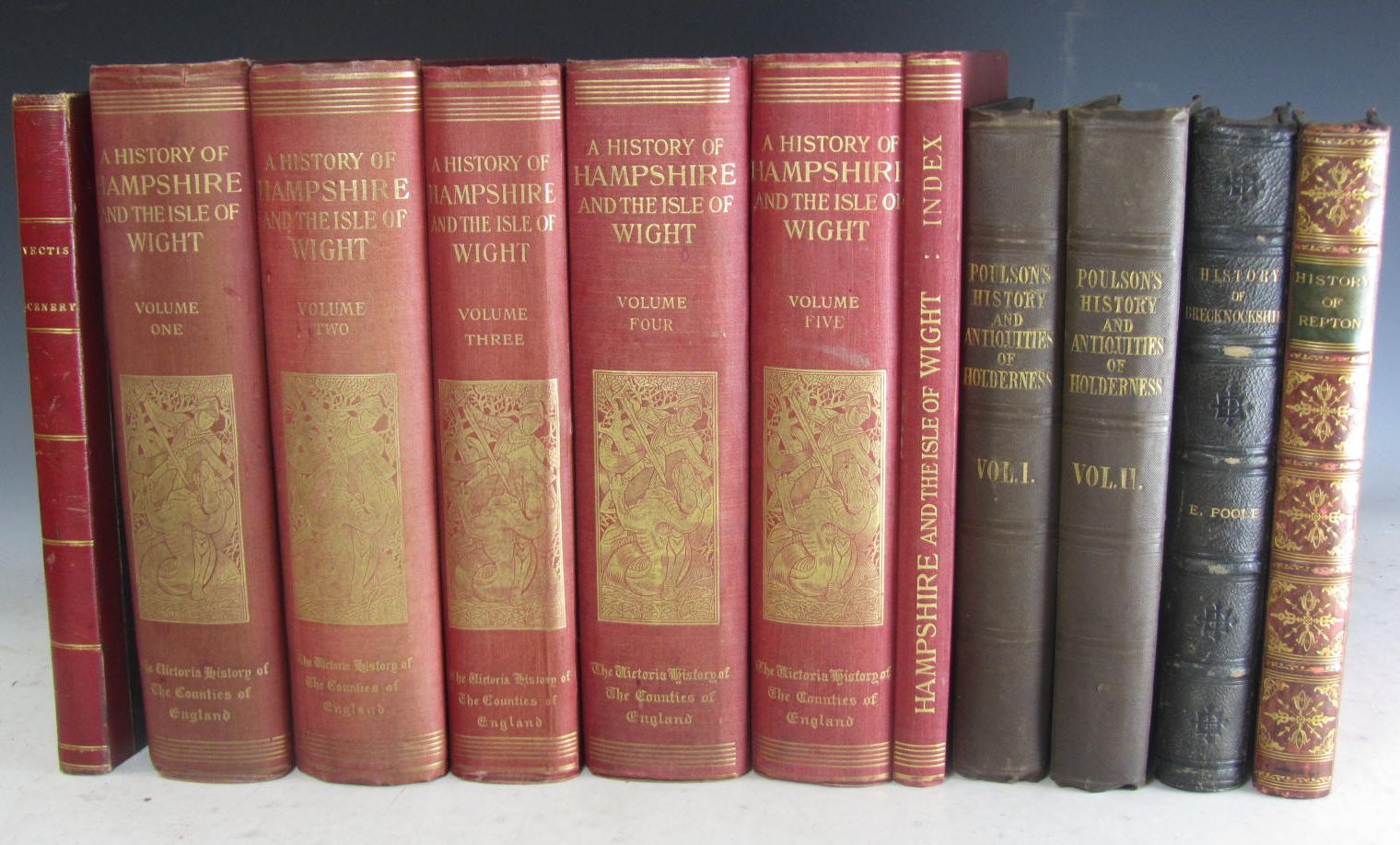Vectis scenery...the Isle of Wight. Isle of Wight: published by the artist, 1844. Folio, engraved title, 36 engraved plates, folding map, contemporary half calf, bookplate, spine a little rubbed and soiled, some fading to covers, occasional light spotting; Poole, Edwin The illustrated history and biography of Brecknockshire... Brecknock: published by the author, 1886. 4to, frontispiece, 14 engraved plates, contemporary green half morocco, bookplate, spine a little rubbed; Poulson, George The history and antiquities of the seigniory of Holderness in the East-Riding of the county of York... Hull: Robert Brown, 1840. 4to, 2 volumes, 2 frontispieces, 38 engraved plates (6 coloured), original cloth, bookplates, a little rubbing and bumping, hinges weak, some spotting; Bigsby, Robert History of Repton. London: Richard Keene, 1854. 4to, portrait, engraved title, 11 plates, contemporary red calf gilt, bookplates, covers and spine a little rubbed and soiled, occasional spotting; The Victoria history of the counties of England Hampshire and the Isle of Wight. Westminster: Archibald Constable, 1900-1914. 4to in eights, 6 volumes, numerous plates and maps, many folding, original red cloth gilt, bookplates of J.P. Shawe-Storey and Lord Gretton, spines faded, some spotting (11)