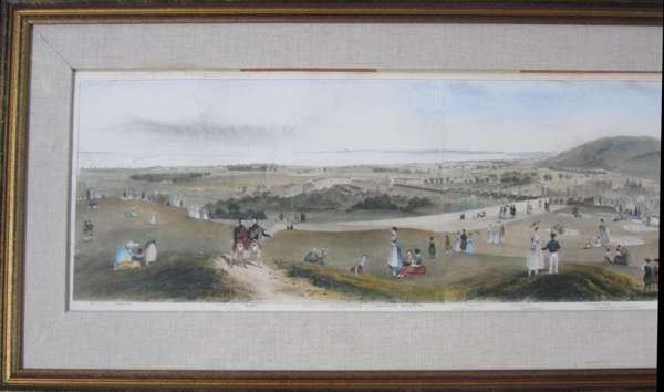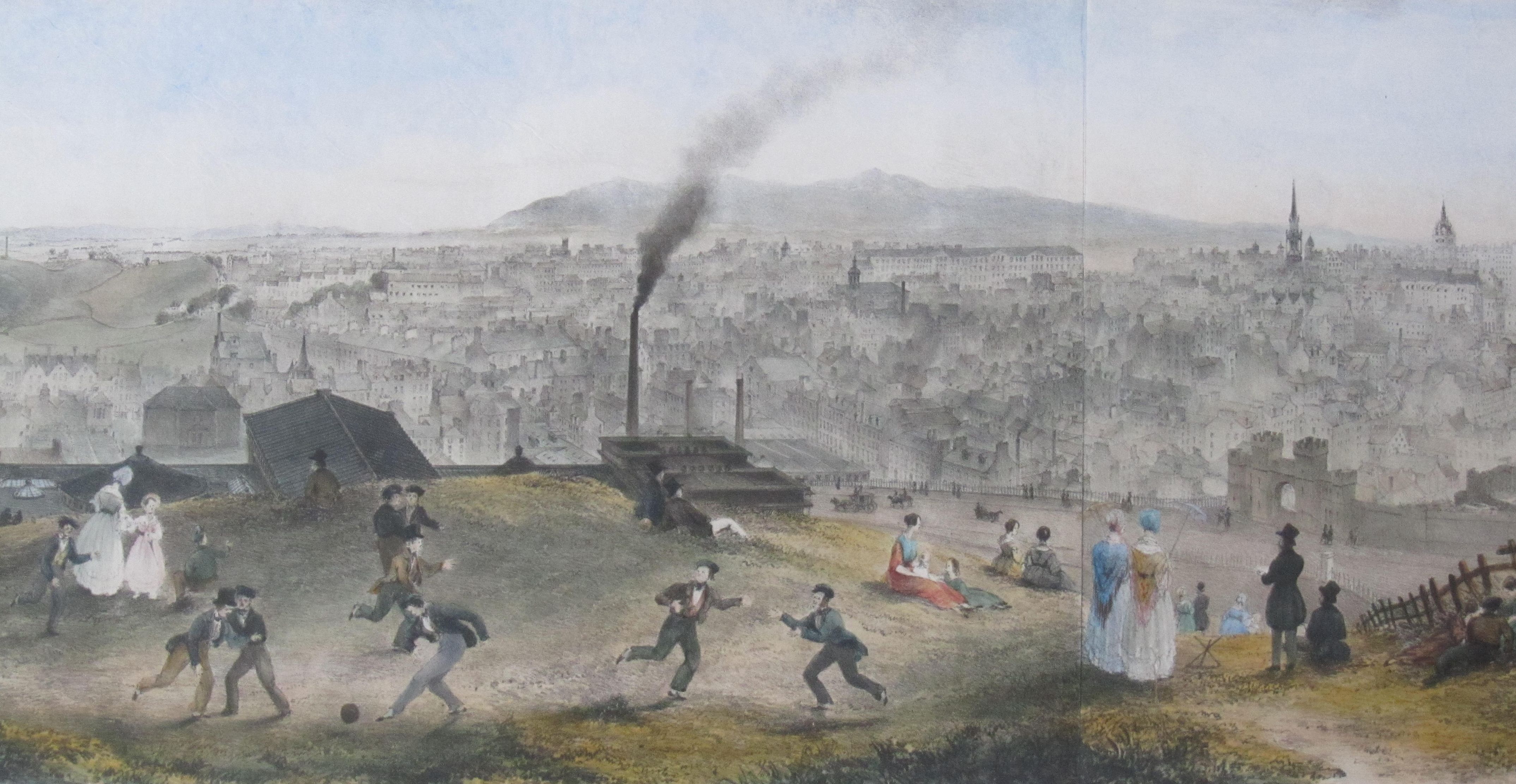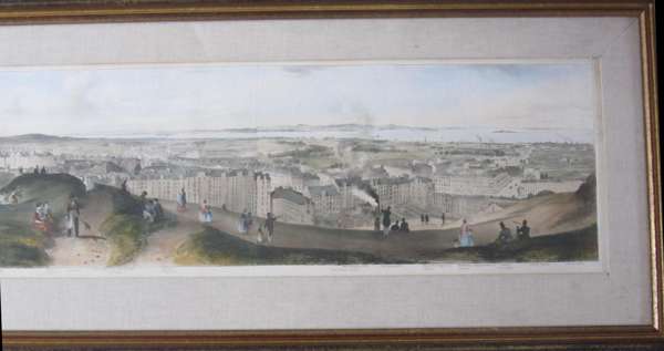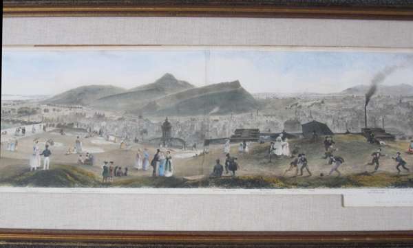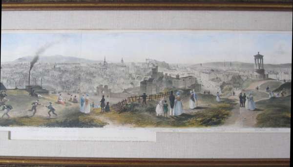 Edinburgh and the surrounding country as seen from Calton Hill, c.1840-50[?], framed and glazed, hand-coloured lithographed panoramic view of Edinburgh with printed marginal labels indicating major landmarks, small amount of repair work to upper left corner and some very slight marginal darkening, dimensions of engraved area c.2240x230mm