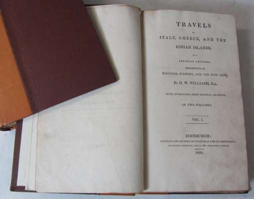 Travels in Italy, Greece and the Ionian Islands. Edinburgh: A. Constable, 1820. First edition, 2 volumes, 8vo, half-titles, 20 engraved plates, modern calf-backed cloth, some spotting, slight dampstaining to upper corners of some leaves of volume 1