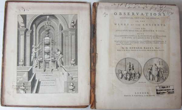 Observations historical, critical and medical on the wines of the ancients. And the analogy between them and modern wines. London: T. Cadell, 1775. First edition, 4to., engraved frontispiece & title-vignette, cropped inscription at head of title, contemporary calf, RCSI library stamp to title, offsetting to title, worn, frontispiece, final leaf and covers detached