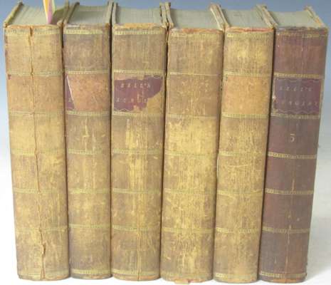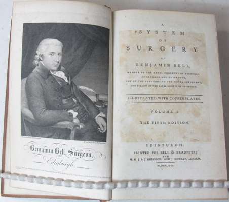 A system of surgery. Edinburgh: Bell & Bradfute, 1791. Fifth edition, 8vo, engraved portrait frontispiece and 99 plates, contemporary tree calf, rubbed, spine of volume 6 splitting, a few RCSI library stamps but a clean copy