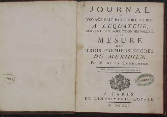 Journal du voyage fait par ordre du roi, a l'équateur. Paris: l'Imprimerie Royale, 1751. First edition, [without supplement], 4to., [2], 36, 280, [15]; 2 folding maps and 5 plates, 4 folding, contemporary calf, RCSI library stamp to title, some spotting, worn, lacks spine
