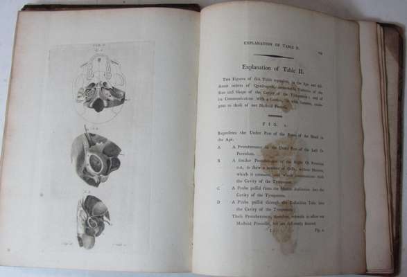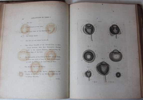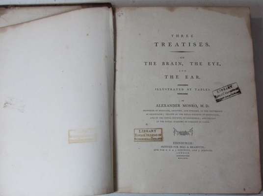 Three treatises. On the brain, the eye and the ear. Edinburgh: G.G. & J. Robinson, 1797. First edition, 4to, [8], 263; 24 engraved plates (including 2 outline plates), one partially hand-coloured, some folding, contemporary half calf, RCSI library stamps to text, some spotting, mainly marginal, a few margins slightly dampstained, worn, covers detached