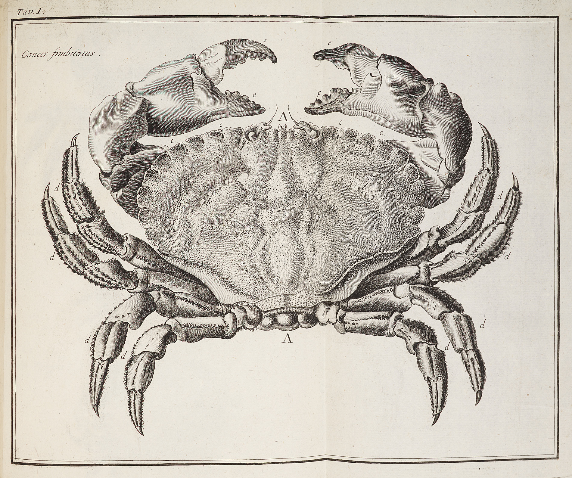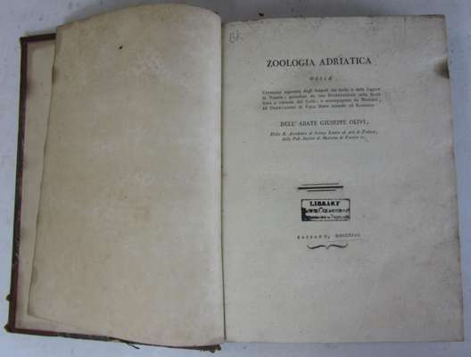 Zoologia Adriatica, ossia catalogo ragionato degli animali del Golfo e delle Lagune di Venezia. Bassano, 1792. First edition, 4to, [8], 32, 334; 9 engraved plates, 4 folding, nineteenth century half calf, RCSI library stamp to title, binding worn