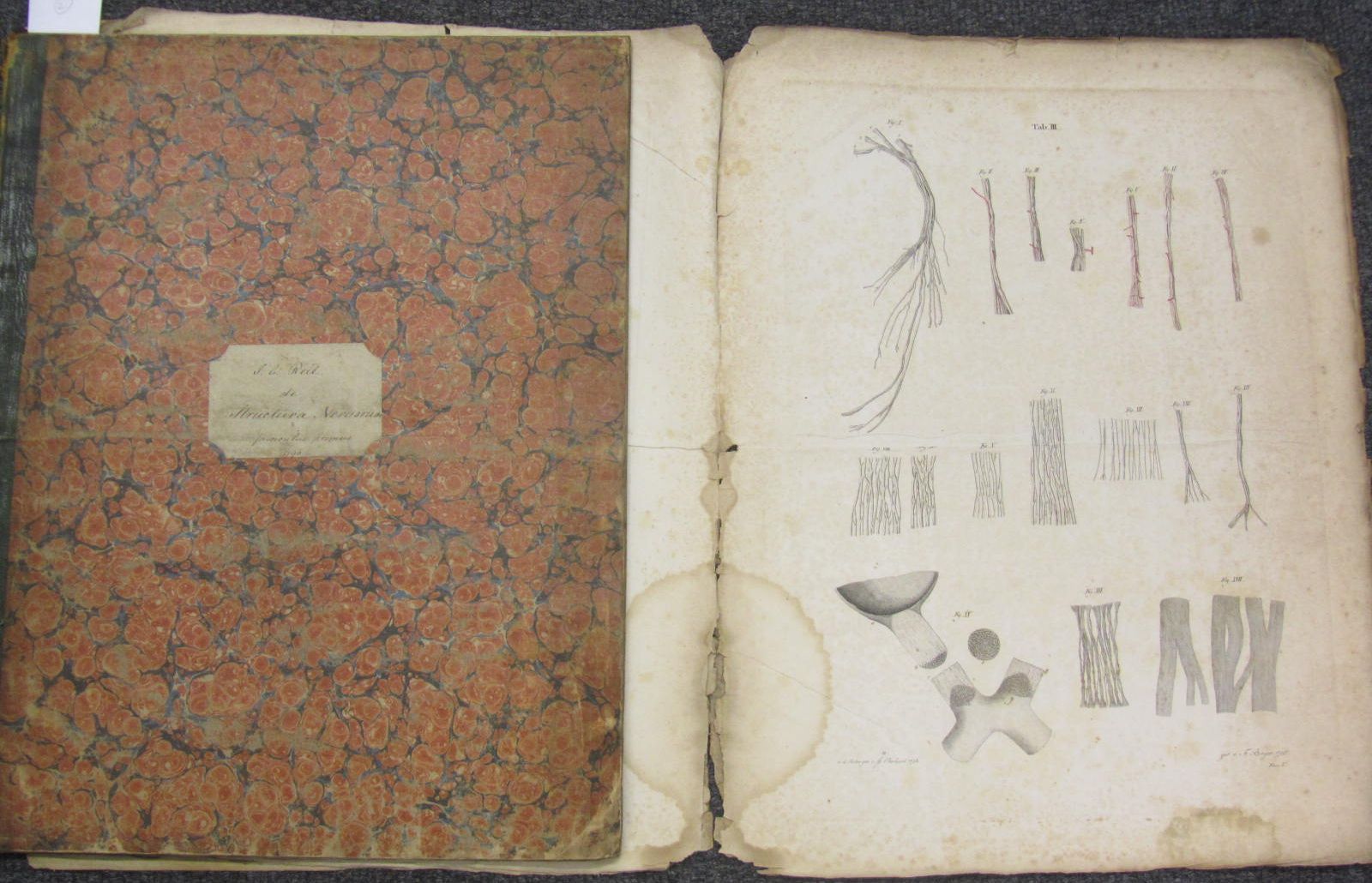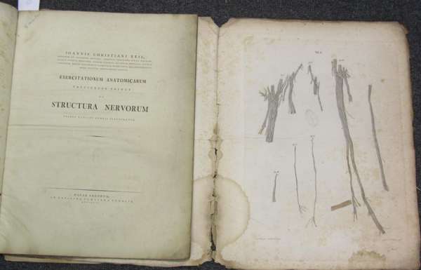 Exercitationum anatomicarum. Fasciculus primus de structura nervorum. Halle: Curt, 1796. Folio, 2 fascicles, (fascicle 2 comprising 3 engraved plates), one partly hand-coloured, green roan-backed marbled wrappers, RCSI library stamp to title and 2 plates, plates spotted, dust-soiled, slightly stained and frayed in inner margin, worn, covers of plate volume detached