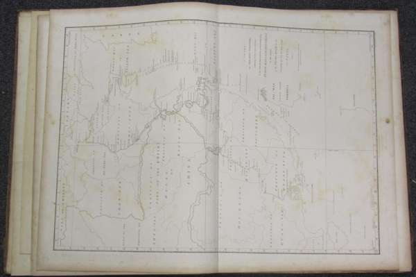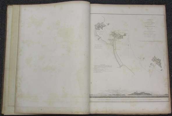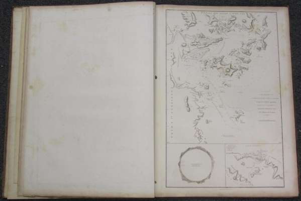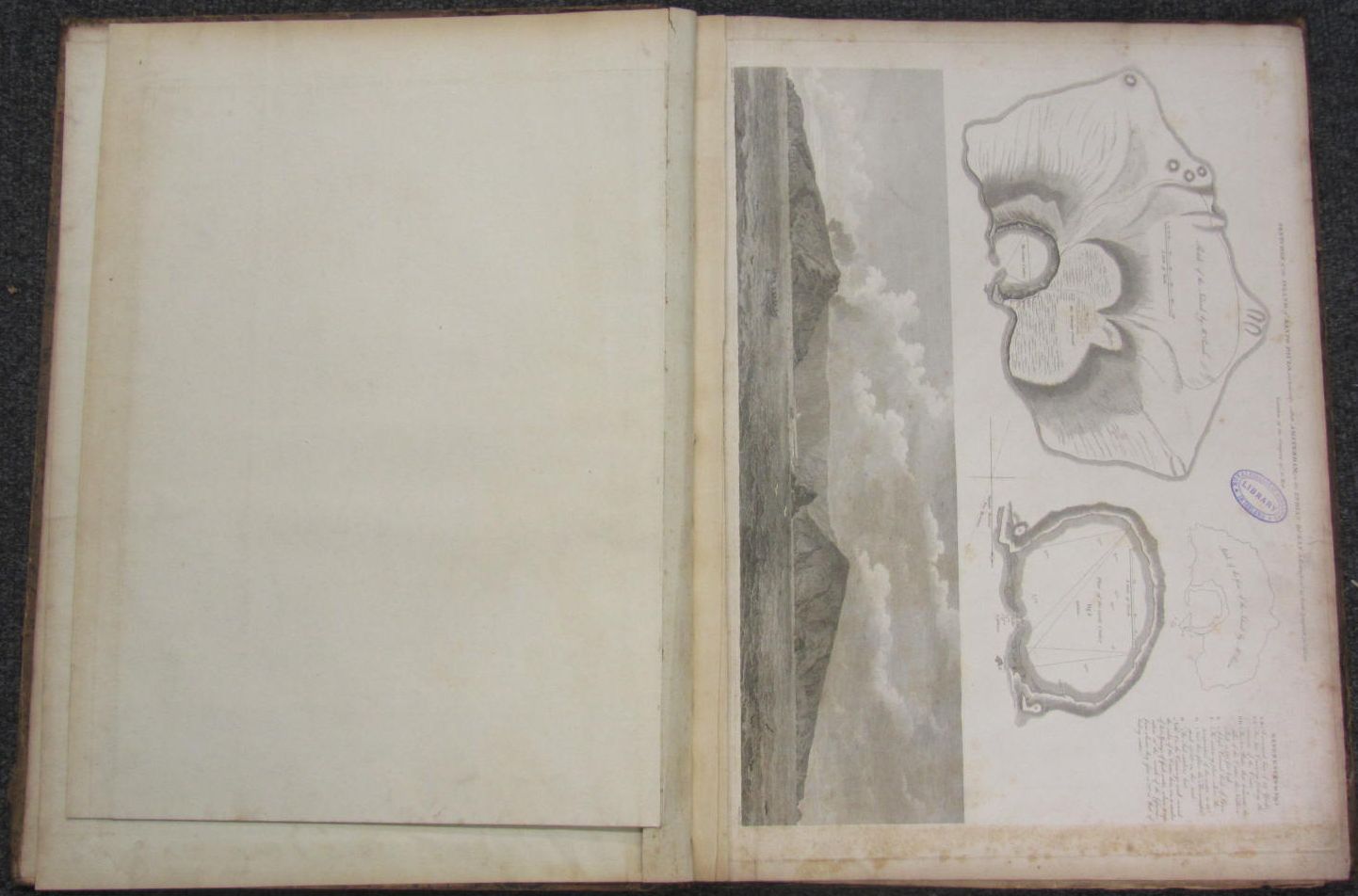 [An authentic account of an embassy from the King of Great Britain to the Emperor of China. [London, 1797]. Folio, atlas volume only, folding map and 44 plates, old half vellum, spotted throughout and very dust-soiled, some marginal tears and repairs, some stains and discolouration, plate 39 torn with loss, RCSI library stamp to a few plates, very soiled and worn, vellum torn