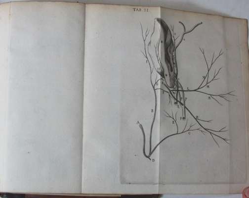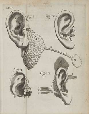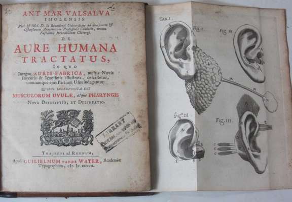 De aure humana tractatus. Utrecht: Wilhelm van de Water, 1717. 4to. [12], 143, [13], 10 folding engraved plates, duplicate of plate 8 bound in, title printed in red and black, contemporary half, spotting to preliminary leaves, RCSI library stamp to title and text, rebacked, corners repaired, [Wellcome Library Catalogue, Record No: 12039706]