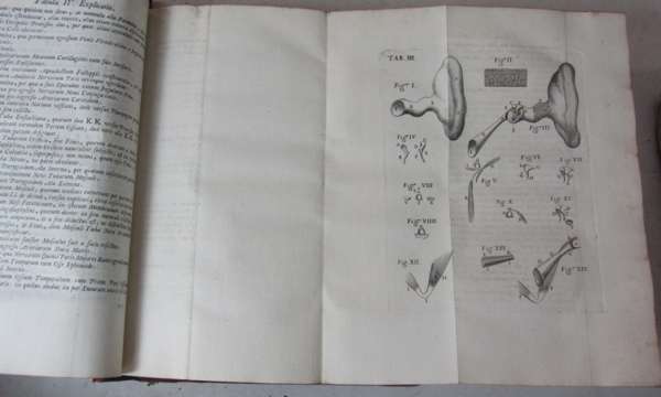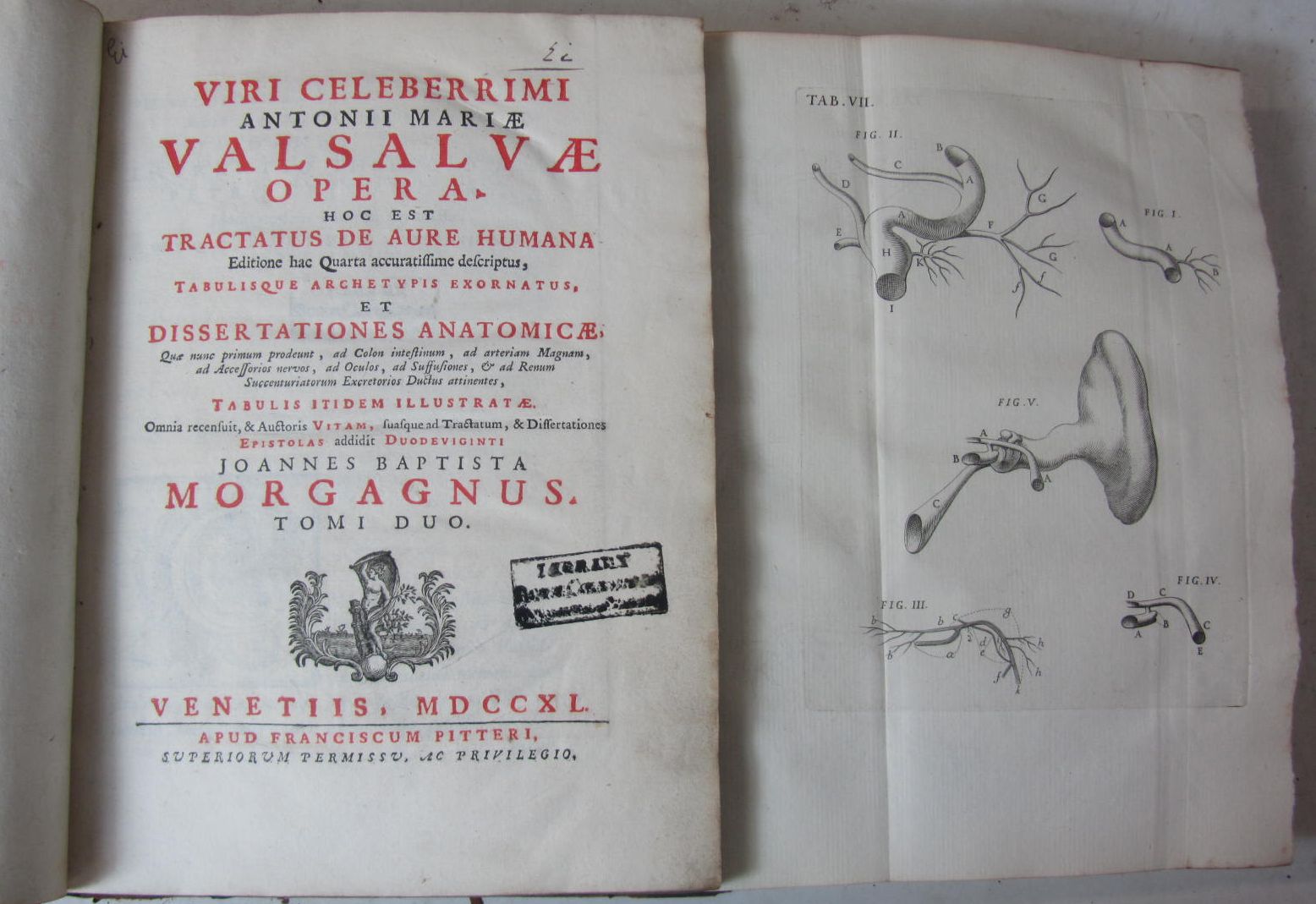Opera. Venice: F. Pitter, 1740. 2 volumes, 4to., [34], 155, [16], 531, [2]; 504; portrait and 13 folding engraved plates, title of volume 1 printed in red and black, errata leaf in volume 1, contemporary calf, RCSI library stamp to title and several text leaves, occasional marginal dust-soiling, worn, three covers detached