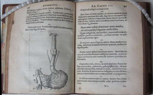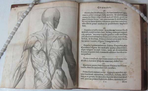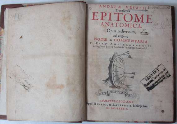 Epitome anatomica. Amsterdam: Henri Laurent, 1633. 4to, [viii], 214; title printed in red and black and with engraved vignette, engraved plate at p.67 cropped, engraved illustrations, later half calf, some dampstaining, RCSI library stamp on title, upper cover detached, [Wellcome Library Catalogue Record No: 14632957]