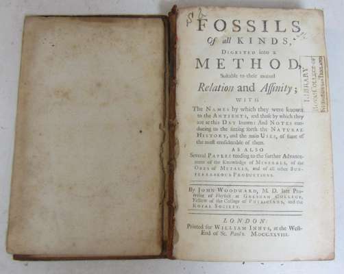 Fossils of all kinds, digested into a method. London: W. Innys. 1728. First edition, 8vo, folding table and 7 plates (1 folding), contemporary calf, RCSI library stamp to title, slightly spotted, rubbed, upper cover detached