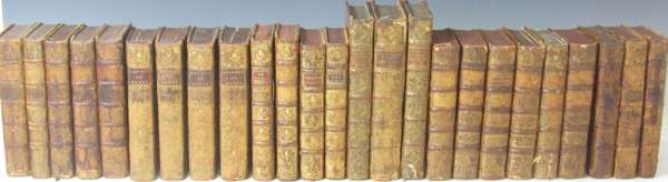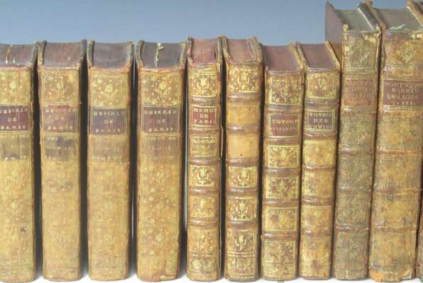 Description de la ville de Paris. Paris, 1752. 4 volumes, 12mo, 40 (of 41) folding engraved plates and maps, contemporary calf, rubbed; [Bauche, publisher] Memorial de Paris et de ses environs. Paris: Bauche, 1749. 2 volumes, 12mo, engraved titles, frontispieces, folding plan, folding map, contemporary calf, rubbed; [Dezallier d'Argenville, A.N.] Voyage pittoresque de Paris. Paris: De Bure, 1752. 12mo, additional engraved title & 4 plates, 2 folding, contemporary calf, rubbed; [Idem] Voyage pittoresque des environs de Paris. Paris: De Bure, 1755. 12mo, engraved frontispiece, contemporary calf, rubbed; Montesquieu, C. de S. De l'esprit des loix. Geneva: Barrilot & fils, 1753. 3 volumes, 8vo, contemporary calf, worn; Sevigné, Mme. de Recueil de lettres. Paris, 1786. 8 volumes, 12mo, calf, worn; Lafayette, Mme de. Oeuvres. Amsterdam, 1786. 8 volumes, 12mo, calf, worn; Rousseau, J.J. Lettres de deux amants. Amsterdam: M.-M. Rey, 1775. 6 parts in 3 volumes, 8vo, engraved plates, calf, rubbed; and 23 others, 18th century French, volumes, worn; sold not subject to return (67)