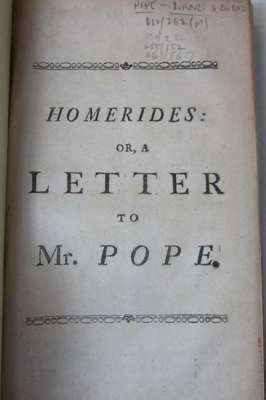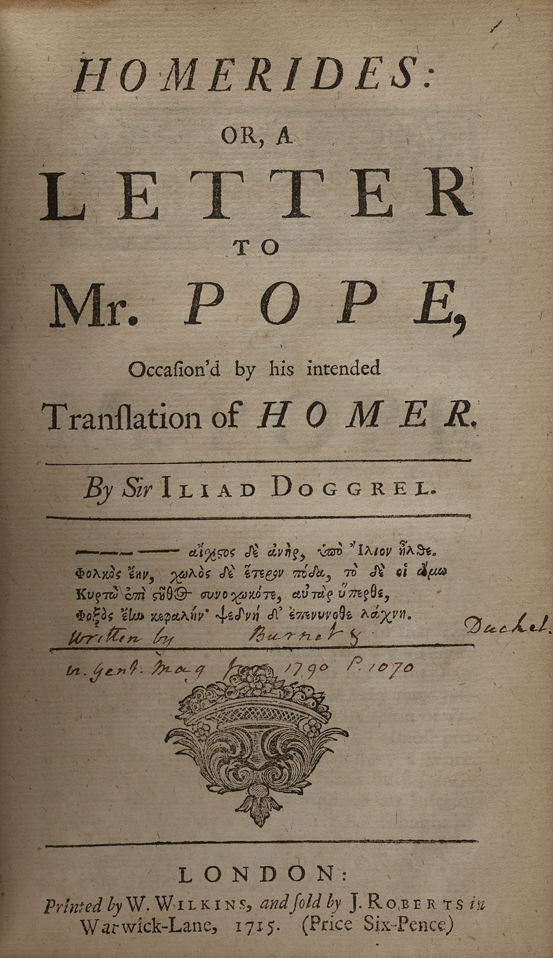 Note: Guerinot pp. 20-23. One of the earliest attacks on Pope, including several anti-Catholic sneers. Published in advance of Pope's translation of Homer, it offers translations intended to serve Pope as a model. The pamphlet was originally intended to have been called "The Hump Conference", containing offensive personal abuse toned down by Addison.
