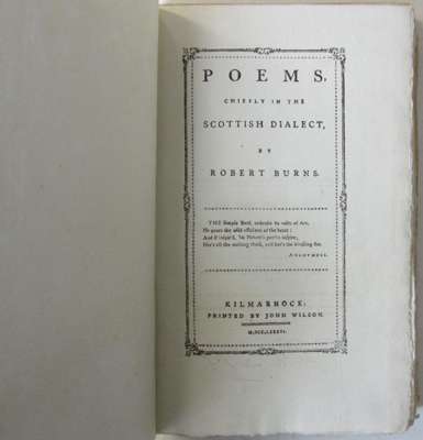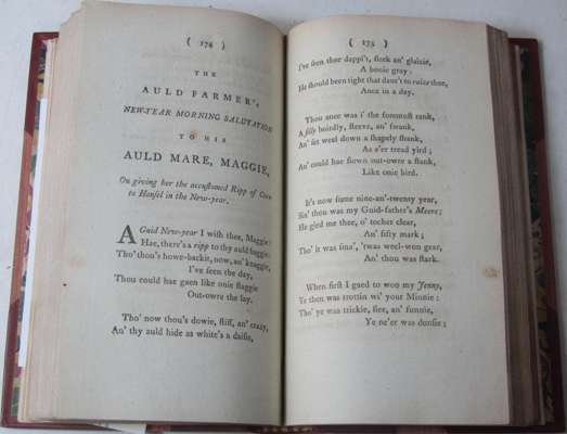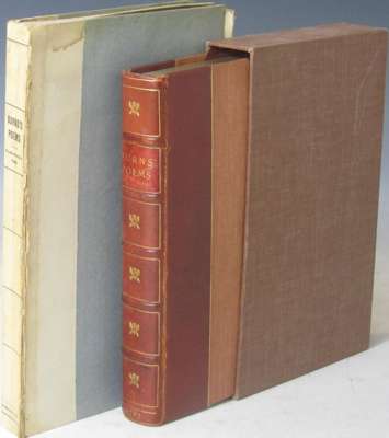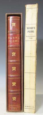 Poems chiefly in the Scottish dialect. Edinburgh: printed for the author, and sold by William Creech, 1787. Second (first Edinburgh) edition, first issue with misprint "Boxburgh" for "Roxburgh", and the correct spelling "skinking" for "stinking" on p. 263, engraved frontispiece portrait, bound without the half-title, twentieth-century half calf, a.e.g., slip case, slightly spotted; and a 1909 Facsimile by D. Brown & Co. of the Kilmarnock edition (2)