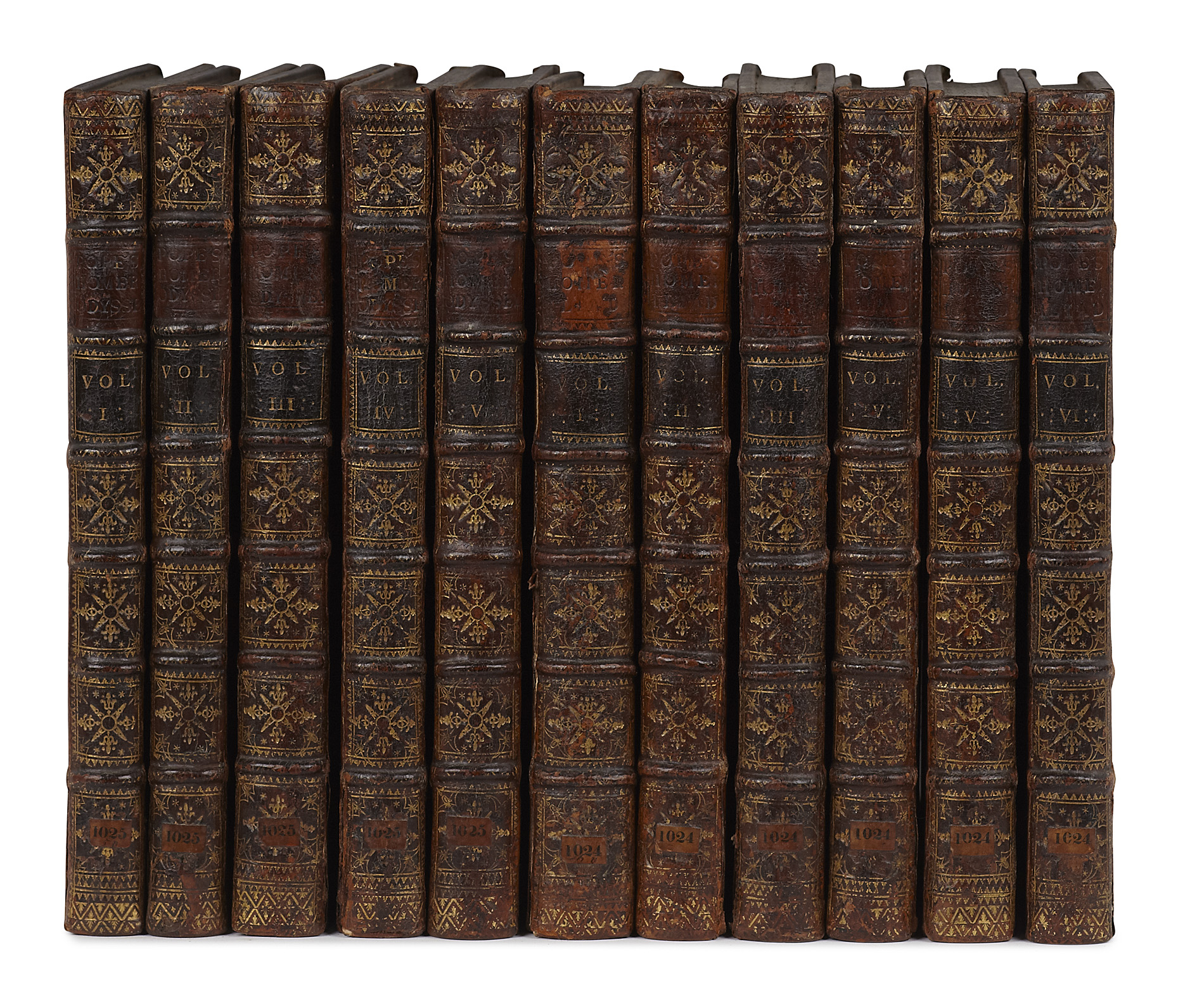 The Iliad of Homer. London: W. Bowyer, for Bernard Lintott, 1715-20. 6 volumes, Folio, engraved frontispiece to volume 1 and with 2 engraved plates and folding leaf with 2 maps, volume 2 lacking the map as frontispiece but with errata, volume 3 lacking the final blank, volume 4 lacking the blank leaf between pp. 123 and 125, volume 5 with 1 folding engraving of the Shield of Achilles by Samuel Gribelin facing p. 129 (and not p. 144 as called for by Griffith 115), [AND] The Odyssey of Homer; translated from the Greek. London: printed for Bernard Lintot [sic], 1725-26. 5 volumes, engraved frontispiece by Vertue to volume 1, volume 1 with large vignette on the titlepage and with the titlepage in red and black, volumes 2, 4 and 5 with titlepage in red and black, and with head and tailpieces, together 11 volumes uniformly bound in contemporary mottled calf, spines decorated gilt in compartments, some wear to joints, heads and tails, some occasional paper discolouration and a few instances of light staining, very neat repairs to the outer corners of pp. 129-132 of volume 1 (11)