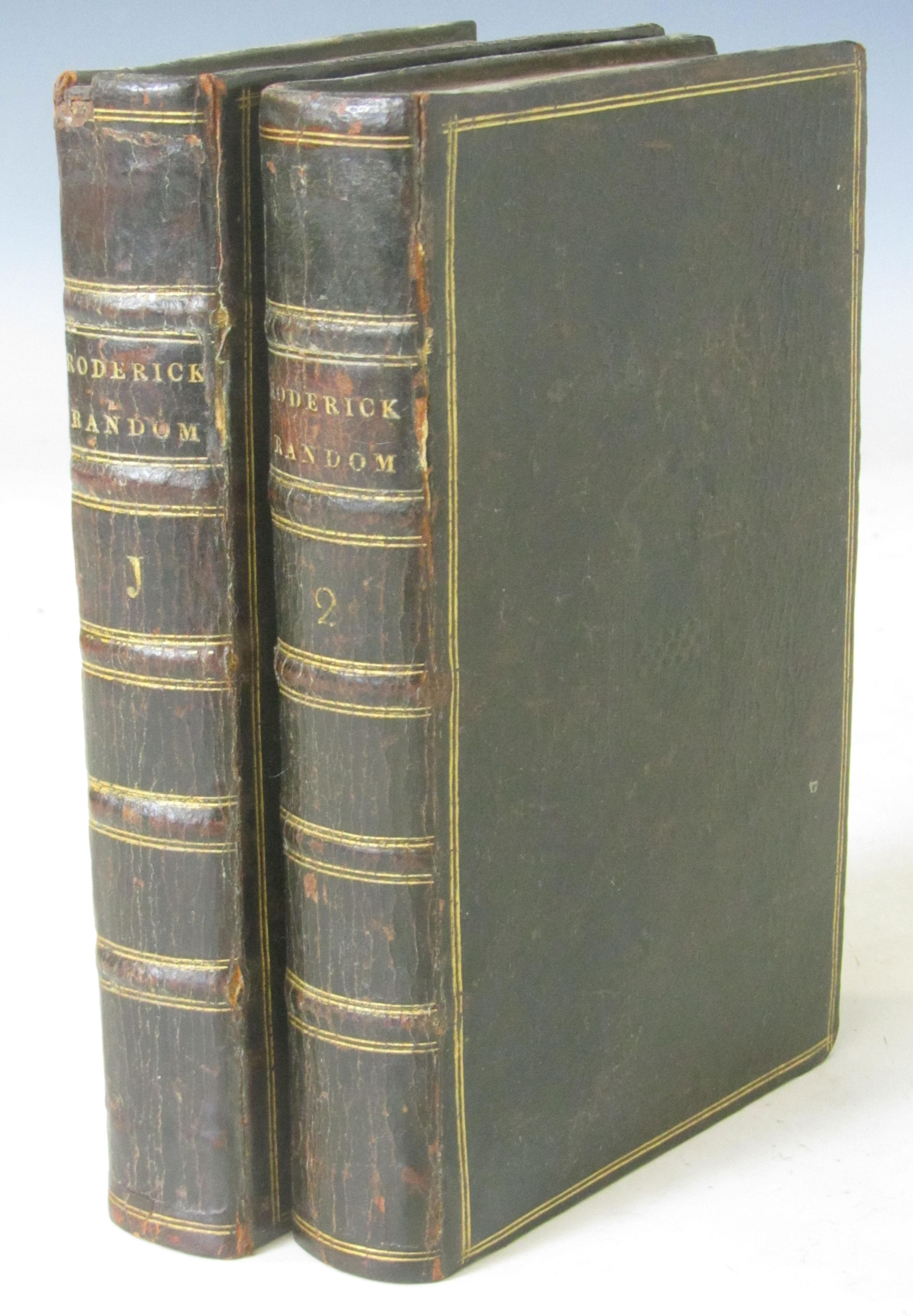 The adventures of Roderick Random. London: J. Osborn, 1748. First edition, 2 volumes, p. I3 in volume 1 uncancelled, contemporary calf, blind stamped coat of arms on the boards, ownership inscription on both titlepages, lacking the final blank in volume 2