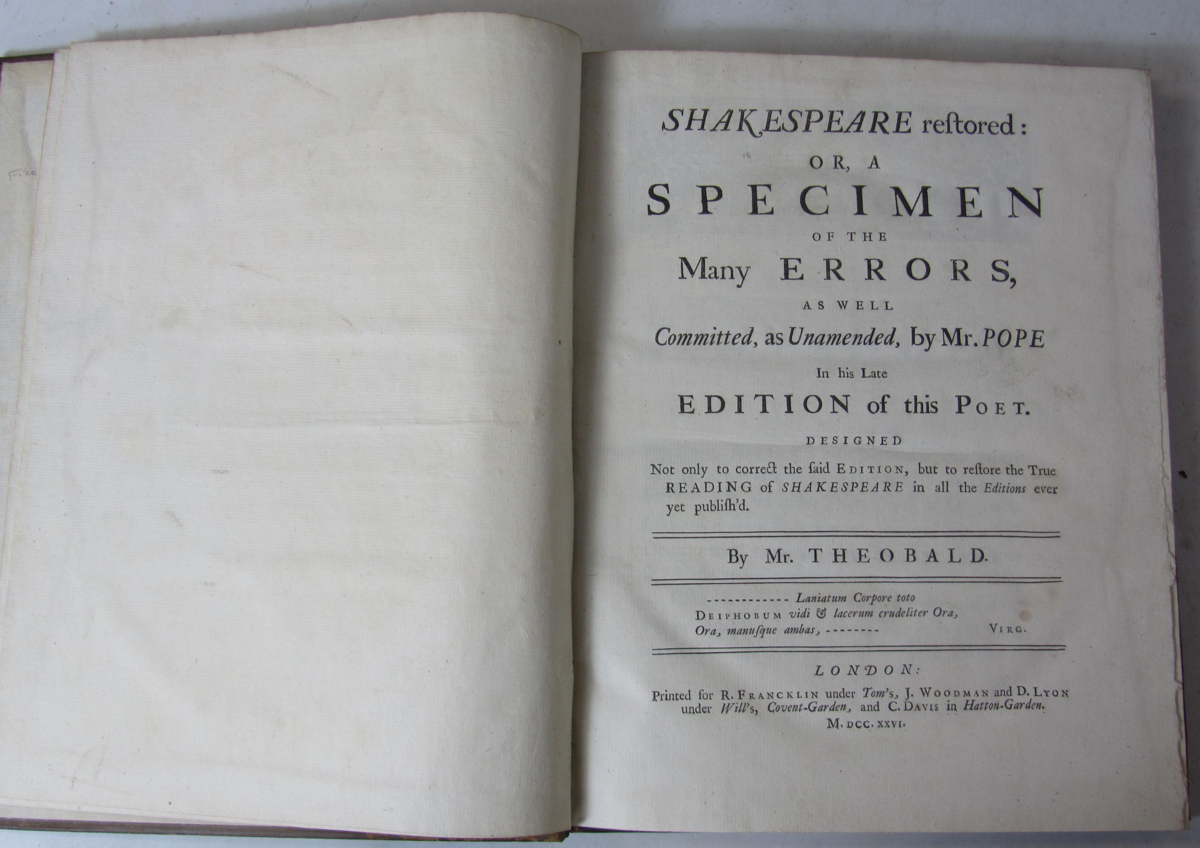 Shakespeare restored: or, a specimen of the many errors, as well committed, as unamended by Mr. Pope in his late edition of this poet. London: Francklin, J. Woodman, and D. Lyon, 1726. First edition, first issue, 4to., contemporary sprinkled calf