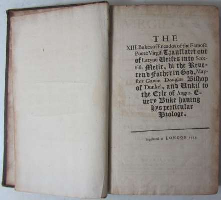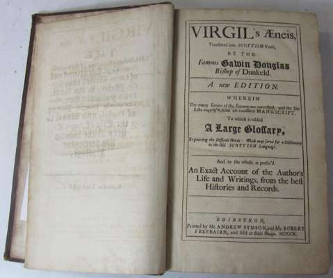 Aeneis, translated into Scottish verse, by the famous Gawin Douglas. Edinburgh: Andrew Symson and Robert Freebairn, 1710. Second edition, Folio, contemporary panelled and sprinkled calf, spine decorated gilt in compartments, joint of upper board weak, occasional slight paper discolouration