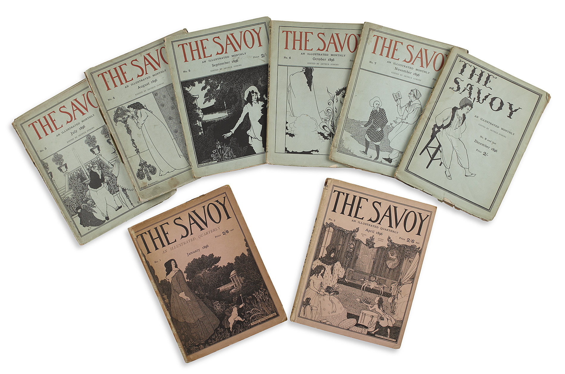 An Illustrated Quarterly, numbers 1-8 (all published). London: Leonard Smithers, 1896 (January-December). 8 volumes, edited by Arthur Symons, plates and illustrations by Aubrey Beardsley, and others, Beardsley's Christmas card design loosely inserted, volumes 1 and 2 in original pink boards and 3-8 in original green wrappers, volume 1 a little foxed, some loss to spines and some soiling, chipping and fading to covers and boards, covers of volume 4 detached and repaired, lower cover of volume 3 detached and covers repaired (8)