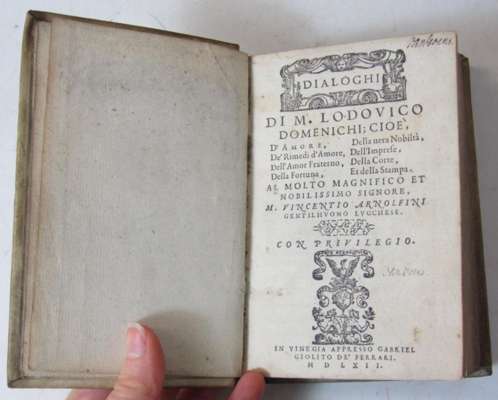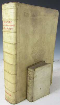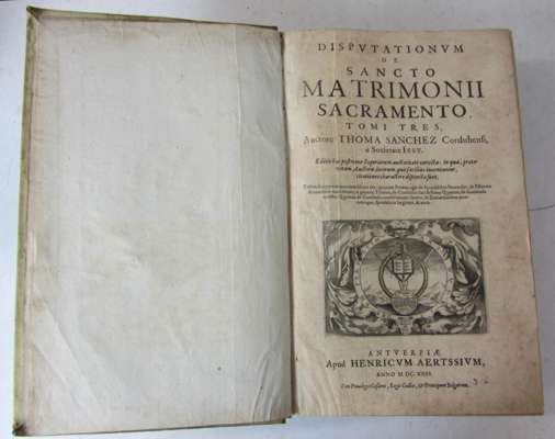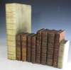 Disputationum de sancto matrimonii sacremento. Antwerp: Henricus Aertssius, 1626. Folio, 3 volumes in one, contemporary vellum with embossed floral motif to covers, title painted in red on spine, binding a little soiled, repair to page 403 of volume 1, a few small holes in volumes 2 and 3 with loss of a couple of letters, darkening to some pages; Domenichi, Lodovico Dialoghi. Venice: Gabriel Giolioto, 1562. 8vo, publisher's device to colophon, contemporary? vellum, a small amount of spotting, collates [28], 364, 385-399, [1] (Z7-AA8 possibly never bound in), [USTC 827379]; [Scudéry, Madeleine] Nouvelles conversations de morale... Paris: Sebastien Mabre-Cramoisy, 1688. First edition, 12mo, 2 volumes, engraved frontispiece, contemporary red calf gilt, g.e., covers and spines a little rubbed and soiled, some dampstaining, predominantly marginal; Terentius Afer, Publius Les comédies... Paris: Louis Cellot, 1771. 2 volumes (of 3), 2 engraved frontispieces, 3 engraved plates, contemporary mottled calf, bookplates of Joseph Knight, spines a little rubbed and cracked; Fontaine, Jean de la Contes et nouvelles en vers... Paris: Libraires Associés, 1791 and 1796. 8vo, portrait, engraved frontispiece, 84 engraved plates, contemporary calf, bokplates, slightly rubbed, spines darkened; Misson, Maximilien Voyage d'Italie. Amsterdam: (to be sold in Paris) Clousier, David, Durand, & Damonneville, 1743. 8vo, 2 volumes, frontispiece, titles in red and black, 63 engraved plates (37 folding), contemporary calf, spines and covers a little rubbed and bumped, a couple of closed closed tears to plate 1 in first volume and small hole to p.330 with loss of a couple of letters, very occasional spotting and offsetting, closed tears to plates 57 and 60 in volume 2 (10)