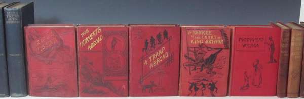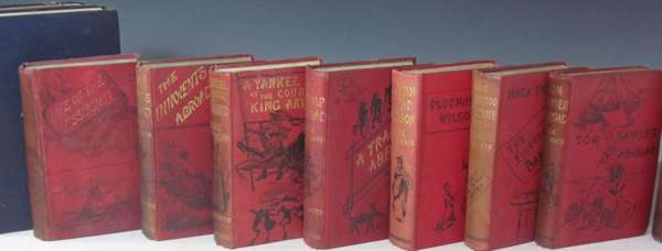 Life on the Mississippi. London: Chatto & Windus, 1883. First edition, frontispiece, illustrations, 32pp. publisher's catalogue dated March 1883, original red pictorial cloth, rubbed and slightly soiled; [Idem] The innocents abroad. London: Chatto & Windus, 1881. First English edition, frontispiece, illustrations, 32pp. publisher's catalogue dated November 1881, original red pictorial cloth, spine discoloured, slightly rubbed; [Idem] A tramp abroad. London: Chatto & Windus, 1880. First one volume English edition, frontispiece, illustrations, 32pp. publisher's catalogue dated October 1880, original red pictorial cloth, lightly marked; [Idem] A Yankee at the court of King Arthur. London: Chatto & Windus, 1889. First English edition, frontispiece, illustrations, 32pp. publisher's catalogue dated October 1880, spine slightly rubbed and discoloured; [Idem] Pudd'nhead Wilson. London: Chatto & Windus, 1894. First edition, frontispiece, 32pp. publisher's catalogue dated Dec. 1894, original red pictorial cloth, spine slightly faded; [Idem] The £1,000,000 bank-note. London: Chatto & Windus, 1893. First English edition, 32pp. publisher's catalogue dated March 1893, original red pictorial cloth, spine faded and slightly marked; [Idem] Tom Sawyer abroad. London: Chatto & Windus, 1894. First English edition, frontispiece, original red pictorial cloth, rubbed; [Idem] Autobiography. New York & London: Harper & Brothers, 1924. First edition, 2 volumes, original blue cloth, rubbed; and 7 later volumes (16)