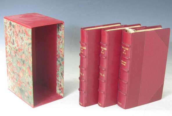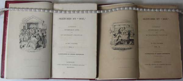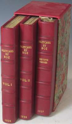Sketches by Boz. London: John Macrone, 1836. First edition, 2 volumes, 8vo, 16 etched plates by George Cruikshank; Sketches by Boz. The Second Series. London: John Macrone, 1837. First edition, issue with no list of illustrations beneath list of Contents on p. (x), 8vo, additional etched title, frontispiece and 8 plates by George Cruikshank, half-title, uniform modern red half morocco, lettered in gilt, marbled slip case