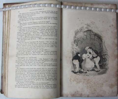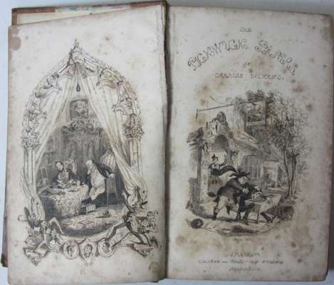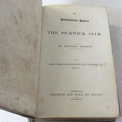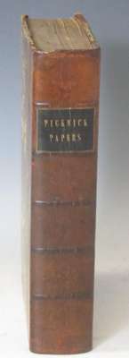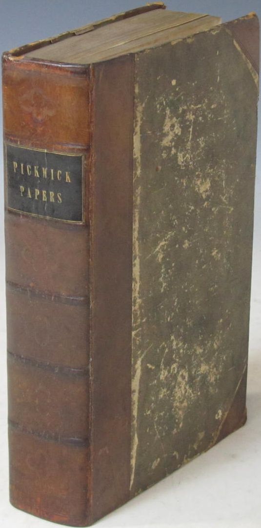 The posthumous papers of the Pickwick Club. London: Chapman and Hall, 1837. First edition in book form, 8vo, first state of vignette title with "Veller" on inn sign, early issue with the two plates etched by Buss, additional title, frontispiece, and 41 plates by F. Seymour, R.W. Buss and Hablot K. Browne ["Phiz"], contemporary half calf, without half-title, plates somewhat spotted, page 5/6 tear repaired affecting a few letters, plate at p. 326 stained, one or two short marginal tears, lacks front free endpaper, slightly rubbed