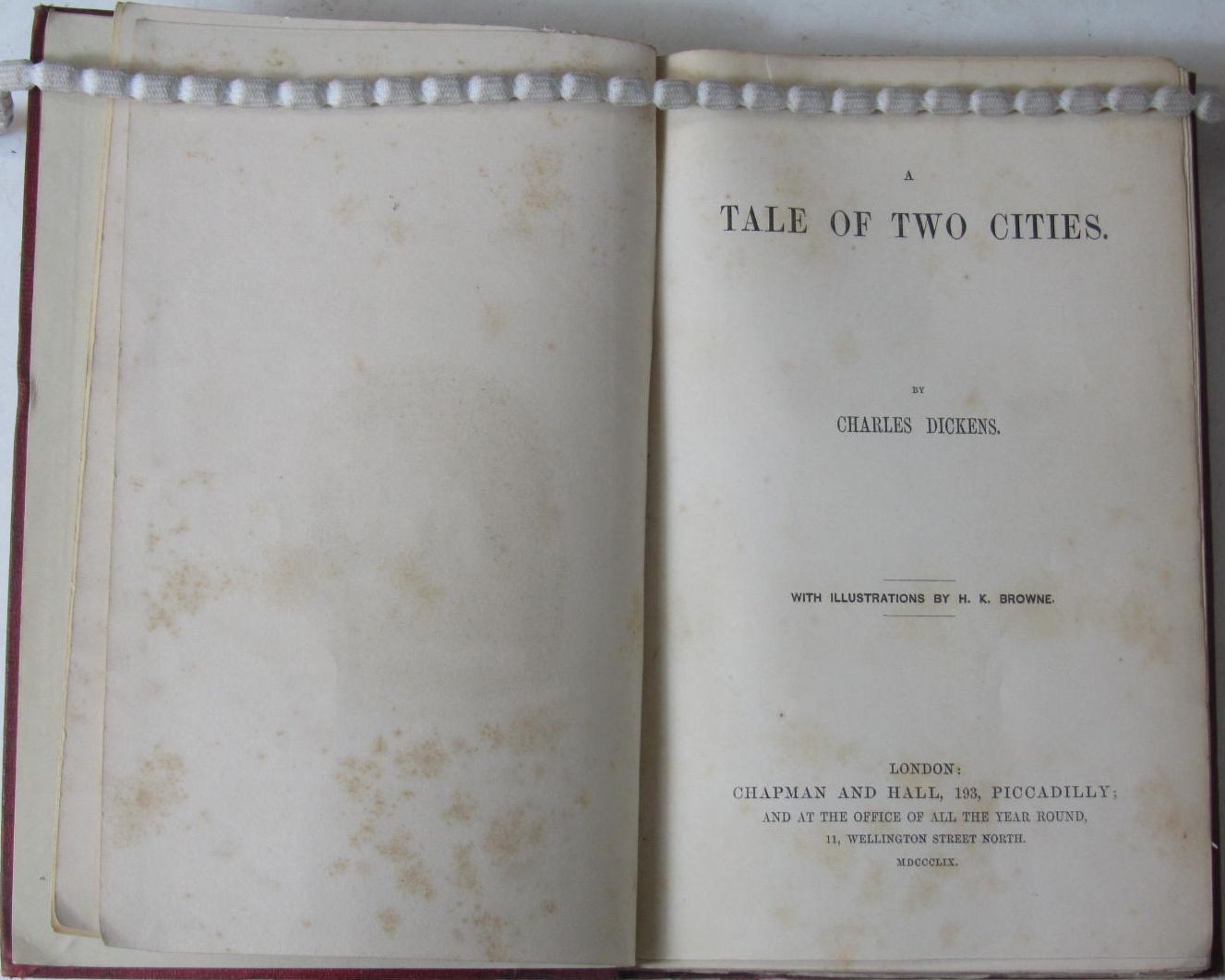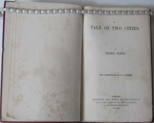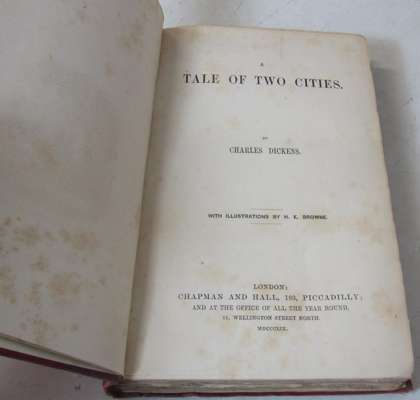 A tale of two cities. London: Chapman and Hall, 1859. First edition, first issue with page 213 misnumbered 113, 8vo, 16 etched plates by H.K. Browne including frontispiece and vignette title, original red blind-stamped cloth, spine gilt, some spotting, old repair to tear in N2, recased with new endpapers, some fading and rubbing, bound without the 32 page catalogue at end (found in some copies only)