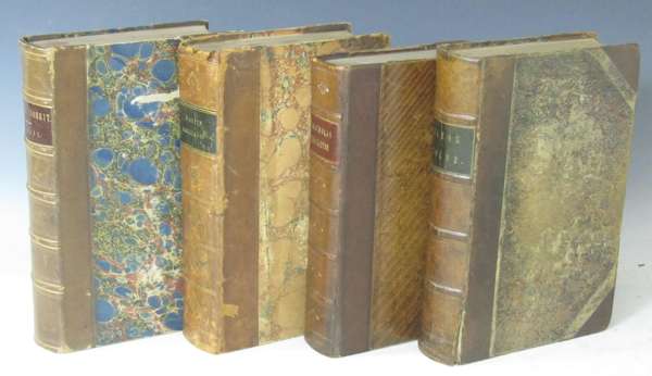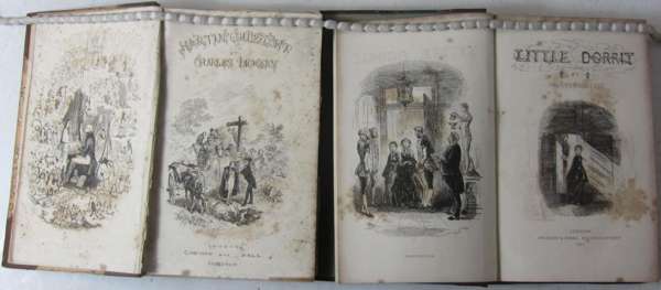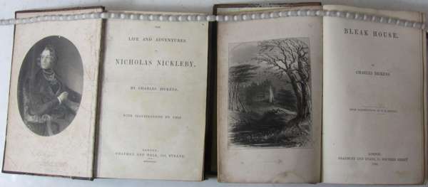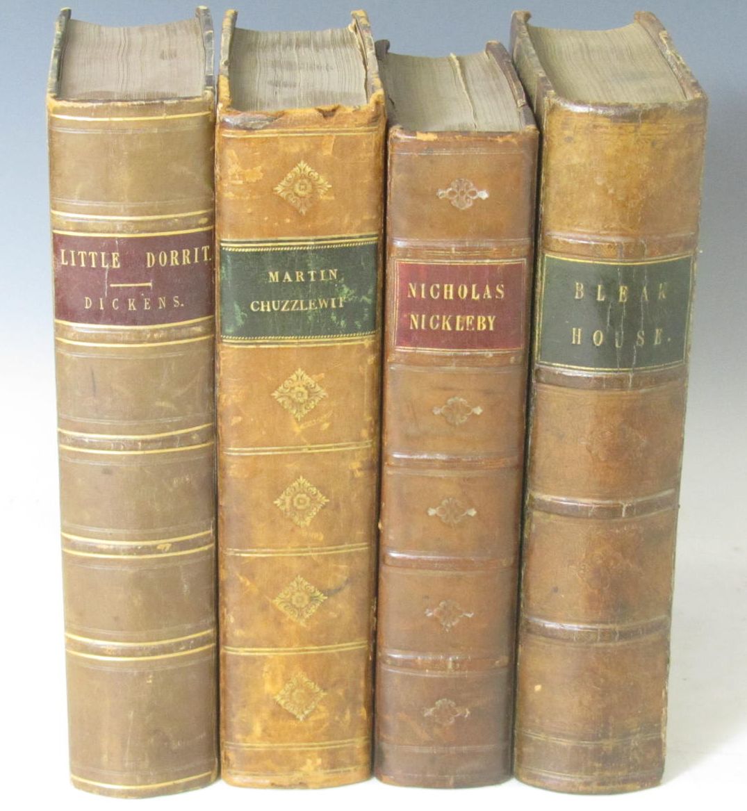 The life and adventures of Nicholas Nickleby. London: Chapman and Hall, 1839. First edition in book form, portrait frontispiece and 39 etched plates by H.K. Browne ["Phiz"], without half-title, with the early misprint "latter" for "letter" (p.160), contemporary half calf, portrait repaired in inner margin, some spotting & offsetting to plates, plate at p.196 and 209 stained; [Idem] The life and adventures of Martin Chuzzlewit. London: Chapman and Hall, 1844. First edition in book form, bound from the parts, '£100' printed correctly, etched frontispiece, additional titlepage and 38 plates, errata leaf, contemporary half calf, spotting, frontispiece & errata leaf almost detached, rubbed, lower joint splitting; [Idem] Little Dorrit. London: Bradbury & Evans, 1857. First edition in book form, bound from the parts, frontispiece, additional titlepage and 38 etched plates by H.K. Browne ["Phiz"], contemporary half calf, with the 'Rigaud' misprints (p.469 on), slight marginal discolouration to the plates, a good copy; [Idem] Bleak House. London: Bradbury & Evans, 1853. First edition in book form, 8vo, lacks half-title, plates spotted and with marginal dampstain, light dampstain at beginning, slightly rubbed, upper joint splitting (4)