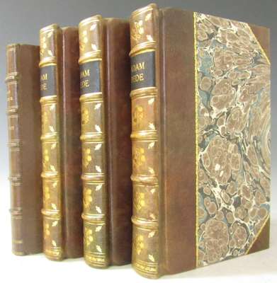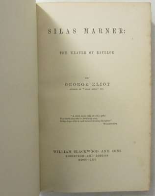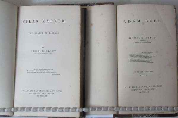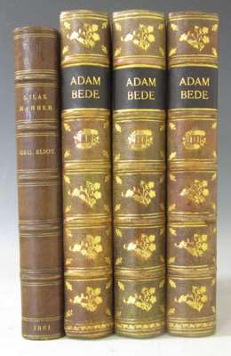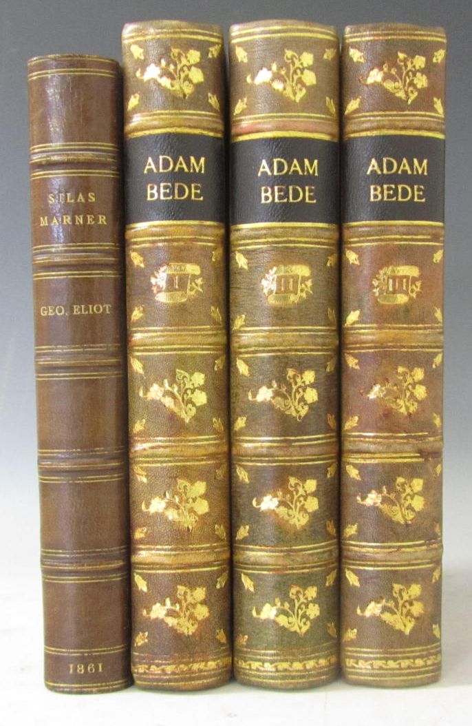 Silas Marner. Edinburgh & London: W. Blackwood & Sons., 1861. First edition, 8vo, half-title, late ninteenth century brown half morocco, spine gilt, t.e.g., some slight spotting; [Idem] Adam Bede. Edinburgh & London: W. Blackwood & Sons, 1859. First edition, 3 volumes, 8vo, half-titles, modern half calf, spines gilt, somewhat spotted (4)
