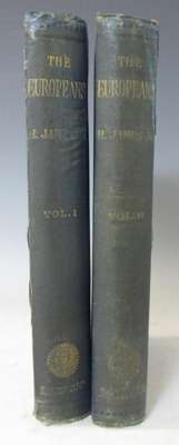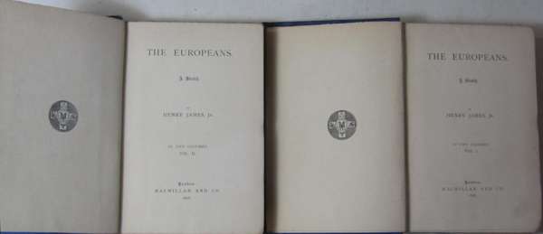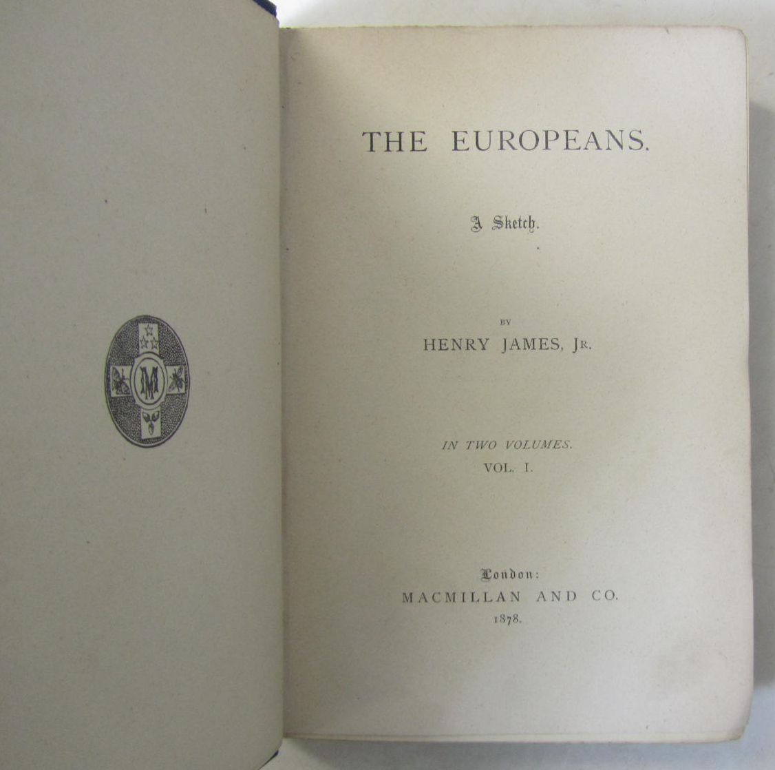 The Europeans. A sketch. London: Macmillan & Co., 1878. First edition, 2 volumes, 8vo, 40 pages of advertisements at end of volume 1 dated June 1878, original blue sand-grain cloth, brown endpapers, armorial bookplates, spines lettered in gilt, some light soiling and marking, edges worn, bindings slightly skewed