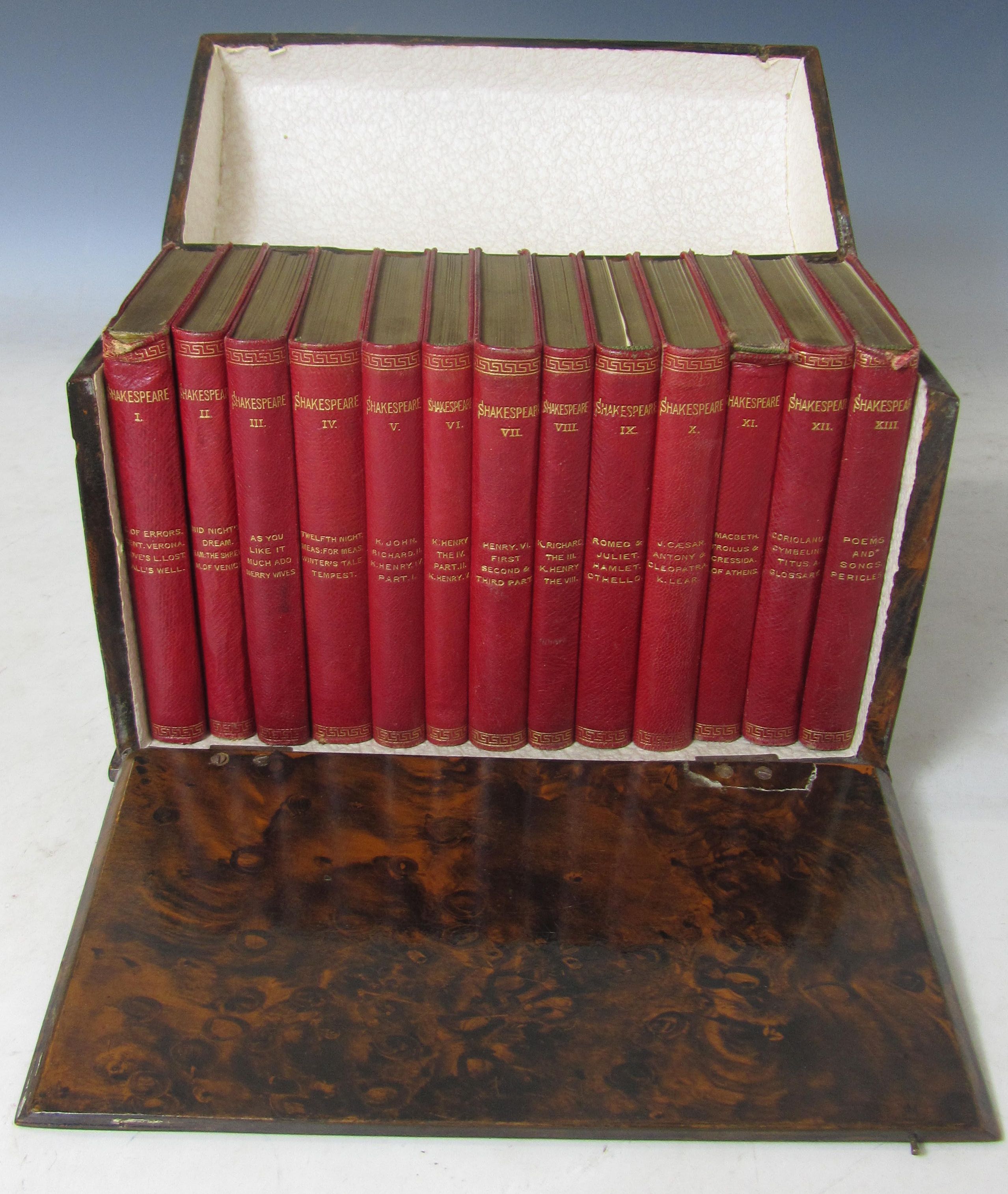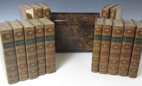 The plays., edited by G. Steevens. London: J. Johnson [&c.], 1803. 10 volumes, 8vo, engraved portrait, contemporary calf gilt; Smollett, Tobias The history of England. London: T. Cadell & R. Baldwin, 1785. 5 volumes, 8vo, contemporary calf, rubbed, one spine very worn; Shakespeare, W. The plays. London: Bell & Daldy, 1868. 13 volumes, 12mo, red morocco gilt, in original miniature wooden chest with lid and hinged front, head of three spines slightly rubbed