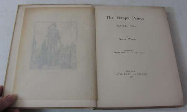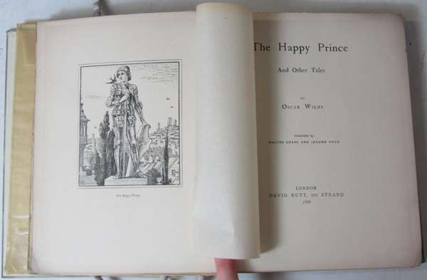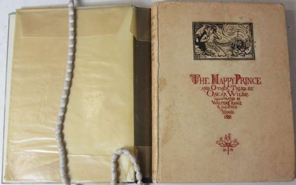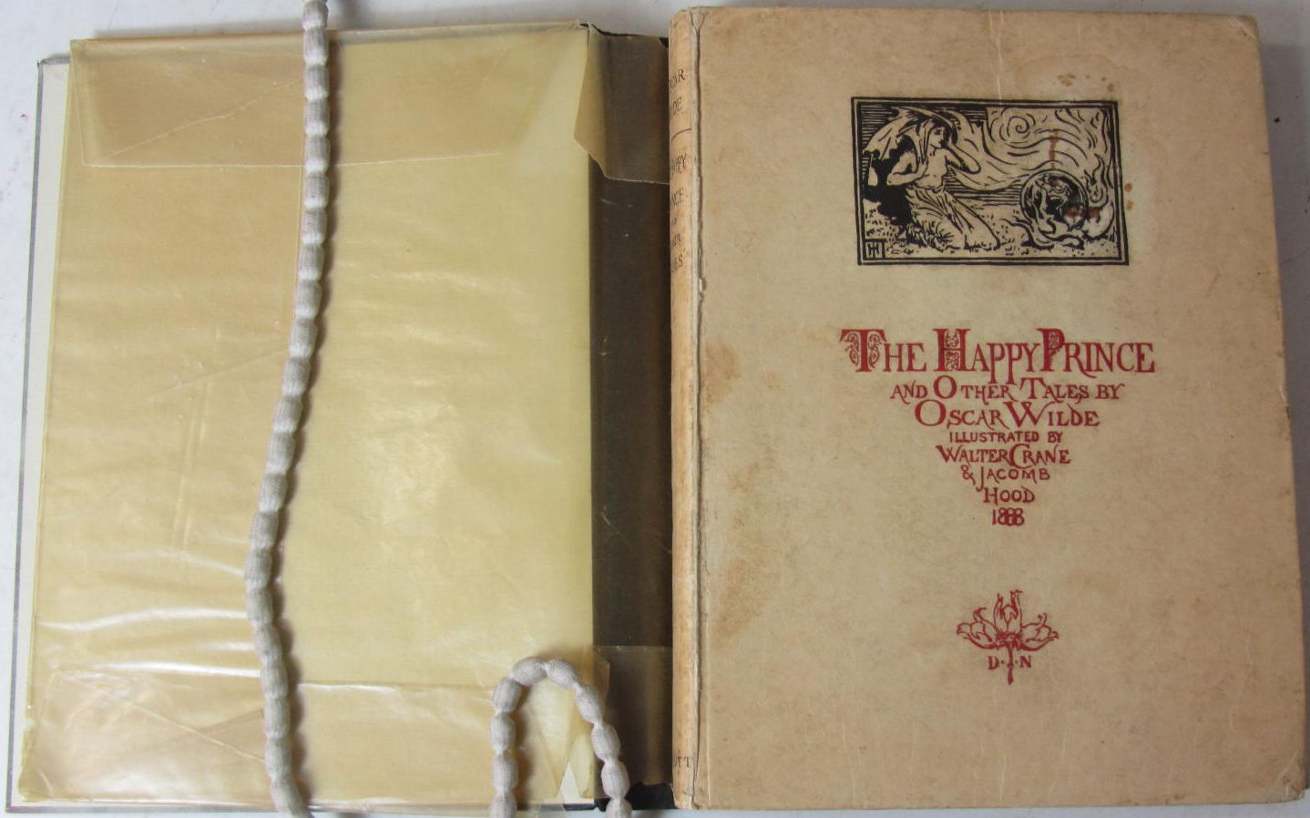 The happy prince and other tales. London: David Nutt, 1888. First edition, illustrated with 3 full-page plates and several decorative head and tail pieces by Walter Crane and Jacomb Hood, half-title, publisher's Japanese vellum boards with upper cover printed in red and black, some very occasional light internal soiling, some soiling to covers and a little wear to upper joint, protected in a quarter morocco custom-made folder with gilt tooled spine and marbled slip case