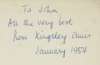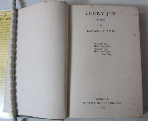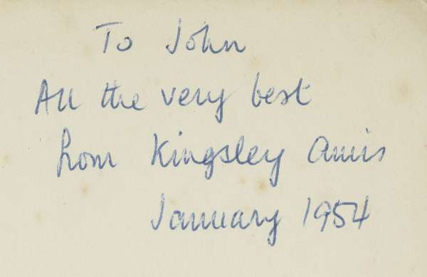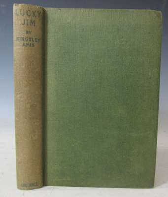 Lucky Jim. London: Victor Gollancz, 1953. First edition, presentation copy "To John, all the very best from Kingsley Amis, January 1954", original green cloth, facsimile dustwrapper, slightly spotted, binding faded