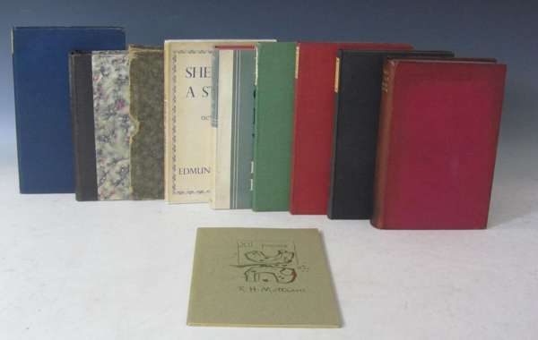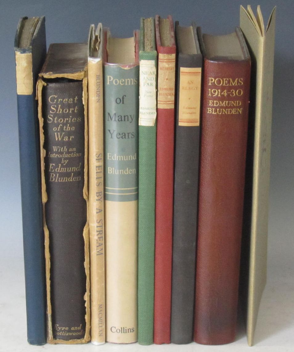 Letter to Clare Blunden from her father, Edmund Blunden, dated July 27th, 1938 and congratulating her on winning a silver medal in school for speaking verse and writing, "...I am about to send "The Anatomy of Oxford" having had my midday sandwich & mug of ale yesterday with C. Day Lewis whom I like more & more. He had just flown from Paris which he thinks the most glorious of all places...", signed "...your affectionate Father." 228x171mm, accompanied by a letter from her mother; Blunden, Edmund The shepherd. London: Richard Cobden-Sanderson, 1922. Second edition, 8vo, inscribed, "with respects by the now Hawthorndenless Edmund Blunden June 20, 1929", original blue cloth with paper label to spine, some foxing and darkening to endpapers, ownership signature of M. Cary Hogg to front free-endpaper, dated 1922, writing to final endpapers in ink, some chipping to ownership label, spine slightly faded and bumped; [Idem (Introduction)] Great short stories of the war... London: Spottiswoode, 1930. First edition, 8vo, number 100 of 250 copies signed by Blunden, t.e.g., original? quarter cloth gilt with marbled boards, slip case, corners a little rubbed, slip case rubbed and splitting slightly in places; [Idem] Shells by a stream. London: Macmillan & Co., Ltd., 1944. First edition, 8vo, original green cloth gilt, dustwrapper slightly soiled and chipped; [Idem] Poems of many years. London: Collins, 1957. First edition, 8vo, original pink cloth gilt, dustwrapper a little soiled and rubbed; [Idem] Near and far, new poems. London: Cobden-Sanderson, 1929. 8vo, original green cloth with paper label to spine, endpapers a little darkened and slight spotting to first and final few pages, and label very slightly chipped; [Idem] Retreat. London: Richard Cobden-Sanderson, 1928. First edition, 8vo, original red cloth with paper label to spine, endpapers very slightly spotted, label a little darkened and chipped; [Idem] An elegy. London: Cobden-Sanderson, 1937. First edition, 8vo, original cloth with paper label to spine, label a little darkened, covers very slightly faded and soiled; [Idem] The poems... London: Cobden-Sanderson, 1930. First edition, 8vo, g.e., original red morocco gilt, some fading to spine and boards; Mottram, R.H. - Blunden, Edmund Twelve poems... [Dublin]: Daedalus Press, 1968. 8vo, number 32 of 312 copies signed by Mottram, original sandy-green and gilt wrappers, wrappers very slightly faded (9, plus letters)