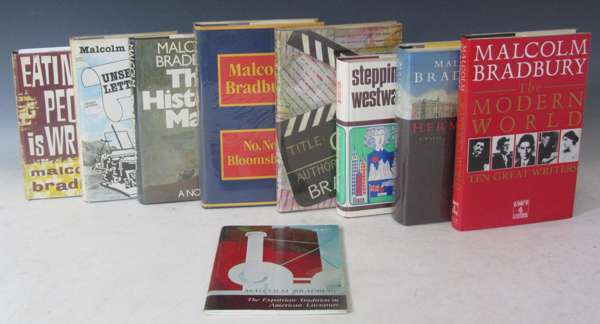 Eating people is wrong. London: Secker & Warburg, 1959. First edition, 8vo, inscribed by Bradbury on titlepage, "For Bruce Ritchie - with my good wishes - Malcolm Bradbury, Edinburgh 2000", original deep red cloth, dustwrapper price-clipped with lower cover slightly soiled and spine a little faded; [idem] Unsent letters. London: André Deutsch, 1988. First edition, 8vo, similarly inscribed from Bradbury to Ritchie, blue cloth, dustwrapper not price-clipped but a little darkened, especially to spine; [idem] The history man... London: Secker & Warburg, 1975. First edition, 8vo, inscribed on title page from Bradbury to Ritchie, black cloth, dustwrapper price-clipped; [idem] No, not Bloomsbury. London: André Deutsch, 1987. First edition, 8vo, inscribed from Bradbury to Ritchie, blue cloth, dustwrapper not price-clipped; and 5 others signed by Bradbury (9)