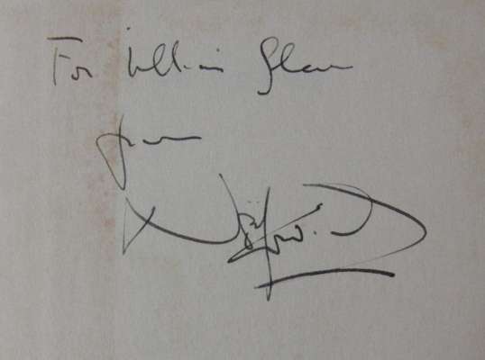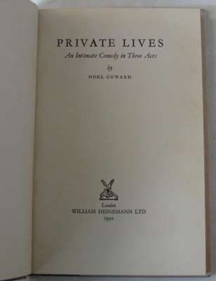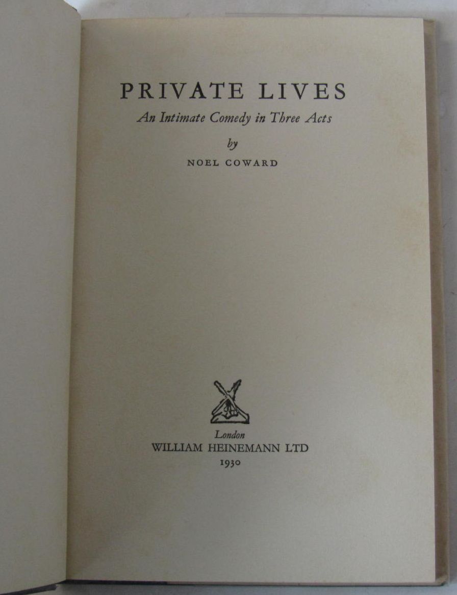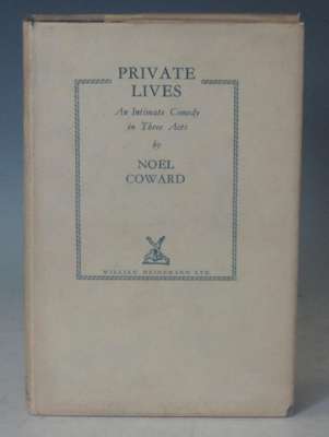 Private lives. London: William Heinemann, 1930. First edition, 8vo, signed by Noël Coward on front free-endpaper and inscribed to, "William Flan[?]", original blue cloth with gilt lettering to spine, dustwrapper not price-clipped, some very slight darkening to endpapers and faint spotting to first and last few pages, very small mark in blue pen to page 17, some minor chipping to dustwrapper at corners and ends of spine, dustwrapper spine a little darkened, some very light spotting and dust-soiling to wrappers