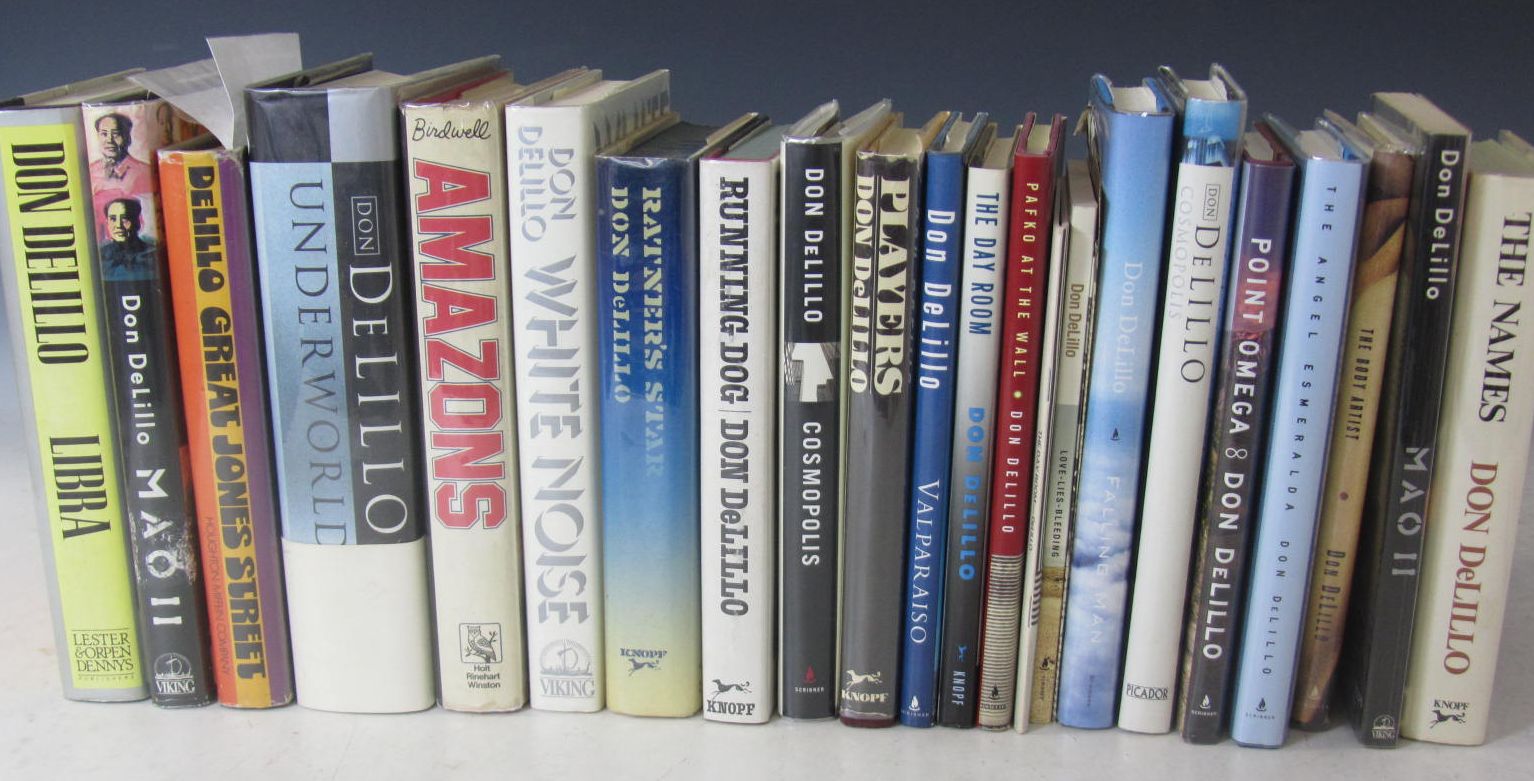 Great Jones Street. Boston: Houghton Mifflin Company, 1973. First printing, 8vo, loose typed autographed letter in franked envelope from DeLillo to Bruce Ritchie, in which DeLillo writes: "Instead of valuable first editions I have some 50c paperbacks I bought decades ago, and although they're probably worth less than 50c today, they do carry the power of memory...", original quarter cloth with red and pink metallic patterns to boards, dustwrapper not price-clipped but with some rubbing and edgewear, a small amount of writing to upper flap of dustwrapper; [Idem] Ratner's star. New York: Alfred A. Knopf, 1976. First edition, 8vo, loose bookplate signed by DeLillo, quarter cloth, dustwrapper not price-clipped, repaired closed tears to two final leaves; [Idem] Running dog. New York: Alfred A. Knopf, 1978. First edition, 8vo, DeLillo's signature laid down to titlepage, quarter cloth, dustwrapper not price-clipped; 'Birdwell, Cleo' [DeLillo, Don] Amazons. New York: Holt, Rinehart and Winston, 1980. First edition, 8vo, DeLillo's signature laid-down to titlepage. quarter-cloth, dustwrapper not price-clipped; [Idem] White noise. New York: Viking, 1985. First edition?, 8vo, loose bookplate signed by DeLillo, quarter cloth, dustwrapper not price-clipped; [Idem] Libra. [Toronto?]: Lester & Orpen Denys, 1988. First edition, 8vo, quarter cloth, dustwrapper not price-clipped; [Idem] Mao II. New York: Viking, 1991. First edition, 8vo, loose bookplate signed by DeLillo, quarter cloth, dustwrapper not price-clipped, but with some damage and repair to spine; [Idem] Cosmopolis. New York: Scribner, 2003. First edition, 8vo, DeLillo's signature laid down to titlepage, loose autograph letter in franked envelope from DeLillo to Ritche, quarter cloth, dustwrapper not price-clipped; and 13 others (21)