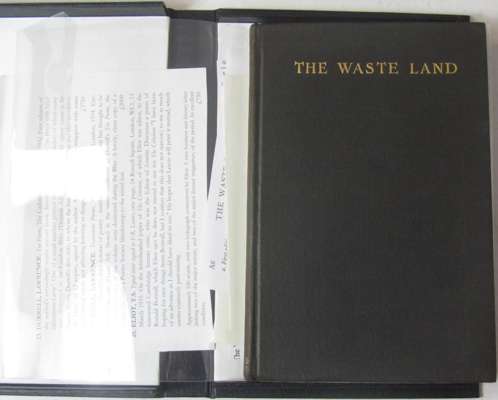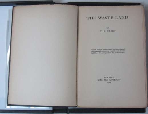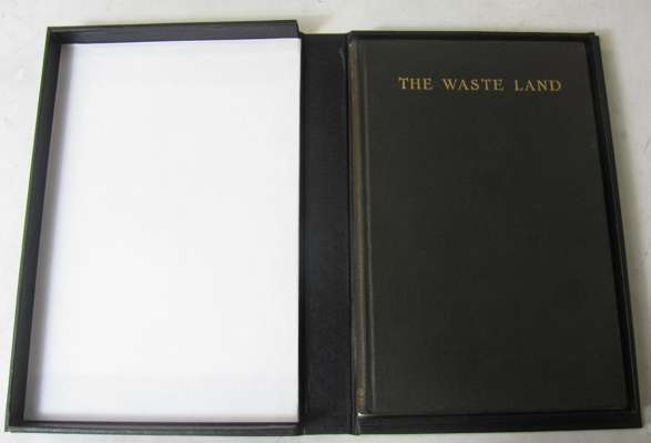 The waste land. New York: Boni and Liveright, 1922. First edition, number 234 of 1000 copies, one of the first 500 copies printed with the limitation number printed in type 5mm high and bound in flexible black cloth, but also a later copy with the "a" dropped from "mountain" in line 339 (page 41), owner inscription on front endpaper, light wear to spine ends, without the rare dustwrapper, black folding cloth box