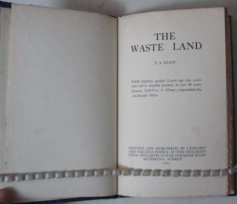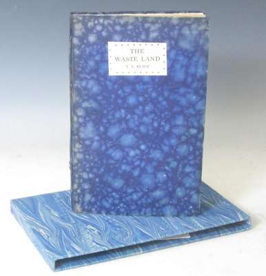 The waste land. Richmond: Leonard and Virginia Woolf at the Hogarth Press, 1923. First English edition, [one of about 460 copies], original blue marbled boards, white printed label within border of asterisks on upper cover, rubbed at extremities of corners and spine ends, rebacked preserving most of original backstrip, in later marbled boards slip case