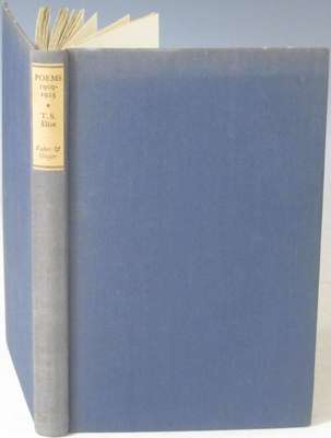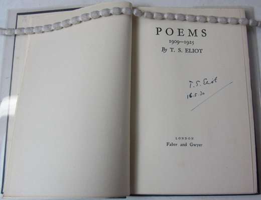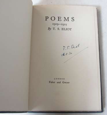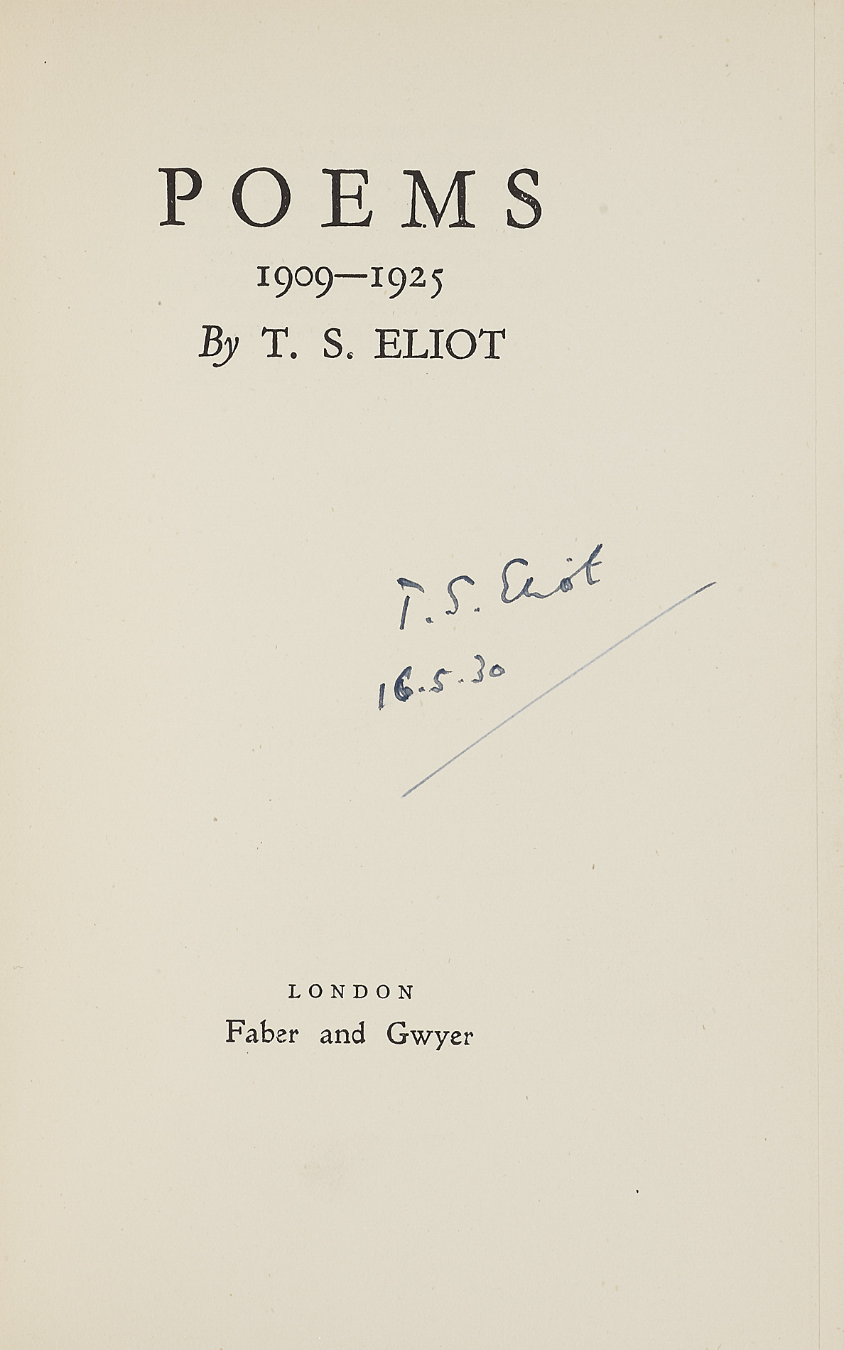 Poems 1909-1925. London: Faber & Gwyer, [1928]. First edition, third impression, signed and dated on title page "T.S. Eliot 16.5.30", original blue cloth boards with white paper label, uncut, spine and head of upper board slightly faded