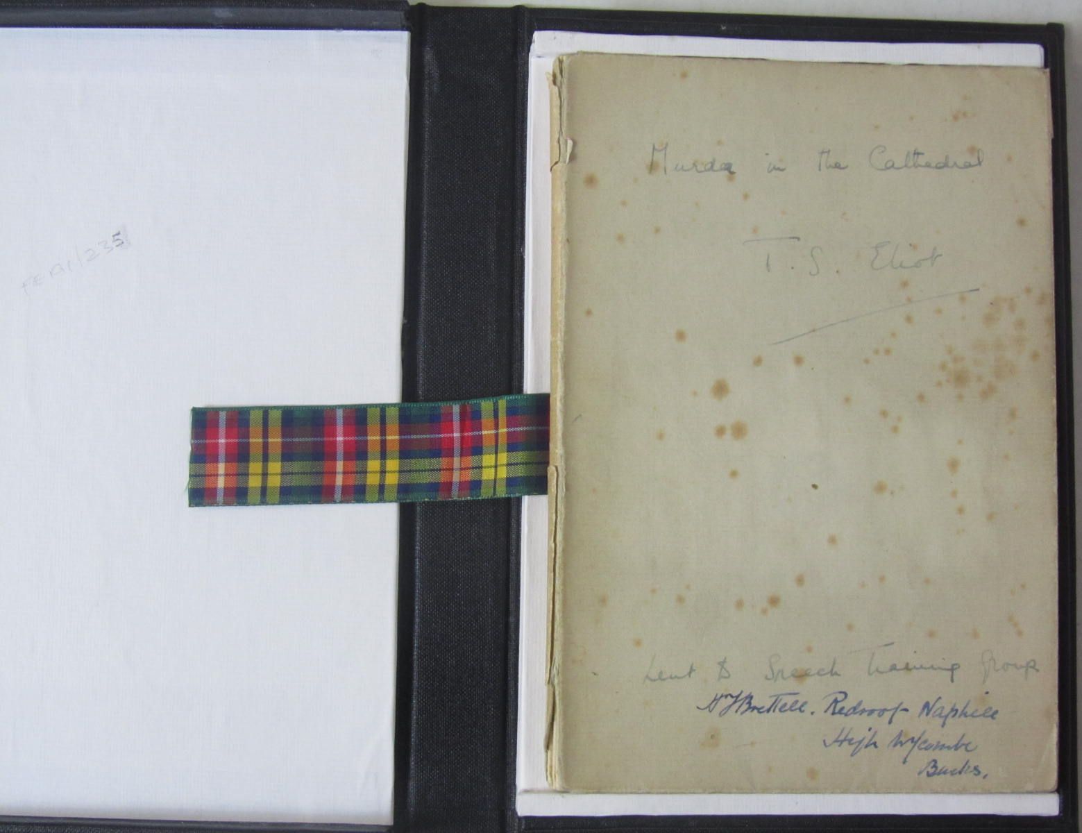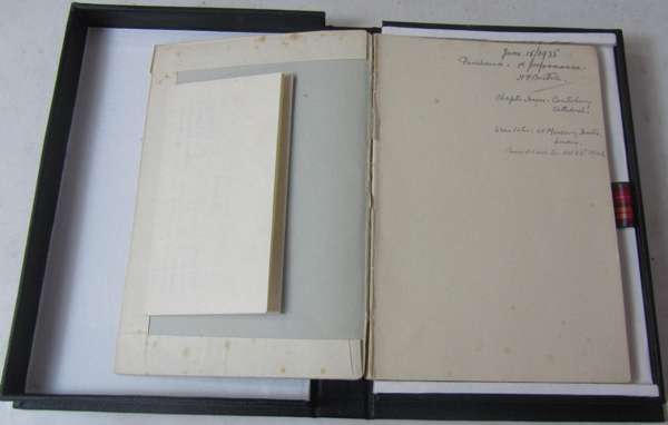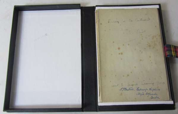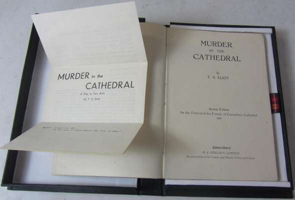 Murder in the cathedral... Acting edition for the Festival of the Friends of Canterbury Cathedral. Canterbury: H.J. Goulden, [1935]. First (acting) edition, inscribed and signed in ink by Eliot "Murder in the Cathedral, T.S. Eliot. Lent to Speech Training Group" on upper wrapper, original printed wrapper concealed by contemporary crude paper dustwrapper, with the original printed flyer listing the cast loosely inserted, folding black cloth box, minor spotting in places, contemporary ownership signature and address of "H.J. Brettell" at foot, and their inscription on front free endpaper, marginal pencillings throughout
