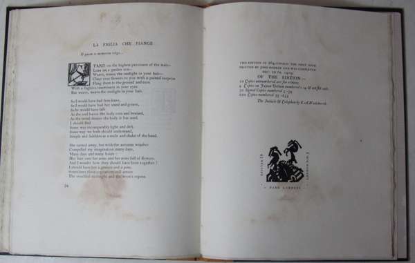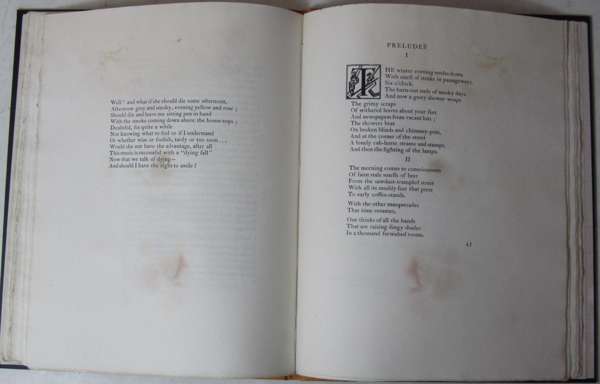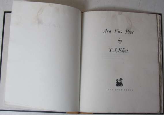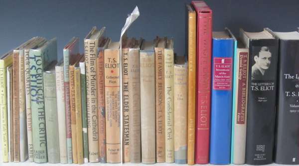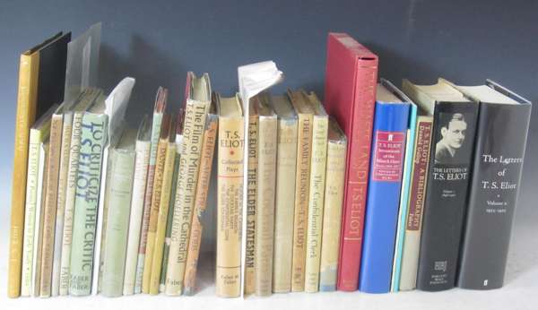 Ara Vus Prec. [London]: The Ovid Press., [1920]. First edition, 4to, limited to 264 copies, out-of-series copy, modern calf-backed black cloth, dampstaining throughout, [Gallup A4]; [Idem] Dante. London: Faber & Faber, 1929. First edition, original pictorial boards, spine worn with loss, [Gallup A13]; [Idem] Ash-Wednesday. London: Faber & Faber, 1930. First trade edition, dustwrapper worn with significant loss, [Gallup A15a]; [Idem] Charles Whibley, a memoir. [London: H. Milord, O.U.P., 1931 [1932]. First edition, original grey wrappers, [Gallup A20a]; [Idem] Sweeney Agonistes. London: Faber & Faber, 1932. First edition, dustwrapper somewhat spotted, several tears; [Idem] The rock. London: Faber & Faber, [1934]. First edition, original grey paper wrappers slightly rubbed, slightly discoloured, [Gallup A26a]; [Idem] Essays ancient & modern. London: Faber & Faber, 1936. First edition, dustwrapper worn with loss, [Gallup A31a]; [Idem] Collected poems 1909-1935. New York: Harcourt Brace & Co., [1936]. First American edition, dustwrapper frayed, [Gallup A32b]; [Idem] The family reunion. London: Faber & Faber, 1939. First edition, dustwrapper frayed and slightly soiled, [Gallup A33a]; [Idem] Old possum's book of practical cats. London: Faber & Faber, 1940. First edition, third impression, dustwrapper discoloured; [Idem] Elizabethan essays. London: Faber & Faber, [1941]. First edition, dustwrapper chipped at head, [Gallup A27a]; [Idem] Points of view. London: Faber & Faber, 1941. First edition, dustwrapper, [Gallup A38]; [Idem] Four quartets. London: Faber & Faber, [1944]. First English edition, dustwrapper somewhat soiled, [Gallup A42b]; [Idem] What is a classic ? London: Faber & Faber, [1945]. First edition, ordinary issue, dustwrapper worn with significant loss, [Gallup A45b]; [Idem] The cocktail party. London: Faber & Faber, 1950. First edition, dustwrapper slightly frayed, [Gallup A55a]; [Idem] Poetry and drama. London: Faber & Faber, 1951. First English edition, dustwrapper, [Gallup A57b]; [Idem], & G. Hoellering The film of Murder in the Cathedral. 1952. Dustwrapper, [Gallup A29i]; [Idem] The confidential clerk. London: Faber & Faber, 1954. First edition, first issue with "Ihad" on p.7, dustwrapper frayed at head and tail of spine, [Gallup A64a]; [Idem] The elder statesman. London: Faber & Faber, [1959]. First edition, dustwrapper, [Gallup A70a]; [Idem] Collected plays. London: Faber & Faber, [1962] First collected edition, dustwrapper discoloured, [Gallup A72]; [Idem] To criticise the critic. London: Faber & Faber, [1965]. First edition, dustwrapper slightly frayed, [Gallup A76a]; [Idem] The waste land, a facsimile and transcript of the original drafts including the annotations of Ezra Pound. London: Faber & Faber, 1971. 4to, number 55 of 500 copies, original cloth, slip case; and 8 others (2 Penguin editions, 2 volumes of The Letters, Gallup's Bibliography, Inventions of the March Hare, ex-library copy of Poems written in early youth; & Gekoski catalogue no. 3) (32)