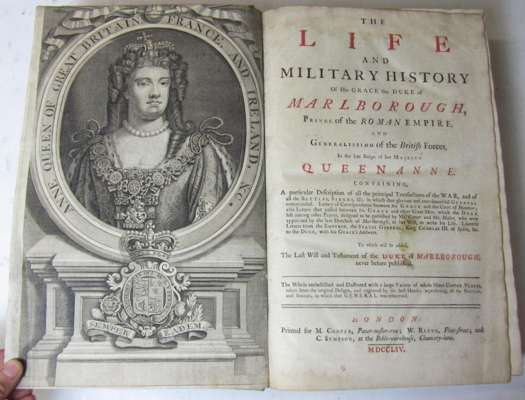 The life and military history of his grace the Duke of Malborough. London: M. Cooper, [&c.], 1754. 4to, engraved portrait, title in red and black, 9 folding engraved plates, boards and spine a little soiled, some internal dampstaining, some tears and repairs to plates; Montgomery, Sir A., Major-General The story of the Fourth Army. London: Hodder and Stoughton, [1920]. 4to, 2 volumes, 19 folded maps, 5 (of 7, 2 and 3 lacking) folding panoramic plates, original red cloth gilt, bookplate of Lord Gretton; Murray, Sir George, editor The letters and dispatches of John Churchill, First Duke of Malborough. London: John Murray, 1845. 8vo, 5 volumes, red cloth gilt, bookplates of Lord Gretton, covers and spines soiled, spines a little chipped; Jones, Sir John T. Journal of the sieges carried on by the army under the Duke of Wellington, in Spain... London: John Weale, [N.d., 1856?]. Third edition, 8vo, 3 volumes, 26 (of 27) folding maps, green cloth gilt, faded, some spotting.Napoleon Memoirs of the history of France during the reign of Napoleon. London: H. Colburn, 1823. 8vo, 2 volumes, purple cloth, bookplates of Lord Gretton, cloth faded and soiled; Hachette & Co. La guerre, racontée par l'image d'apres les sculpteurs les graveurs et les peintres. [N.p.] Hachette et Cie., 1903. 4to, original calf, g.e., bookplate of Lord Gretton, spine faded, covers a little rubbed Moore, James A narrative of the campaign of the British army in Spain. London: J. Johnson, 1809. 4to, engraved portrait, plate, 2 folding maps, contemporary half calf, bookplate of Lord Gretton, rubbed, joints split; And 7 other titles; sold not subject to return (23)