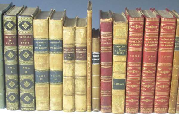 Napoleon in exile. London, 1827. 2 volumes, 8vo, additional engraved titles, frontispieces & 1 plate, contemporary half calf gilt; Bourrienne, M. de Memoirs of Napoloen Bonaparte. Glasgow, [c.1880]. 2 volumes, large 8vo, modern half calf retaining original boards, occasional dampstains; Segur, General Count P. de History of the expedition to Russia. London, 1827. 2 volumes, 8vo, additional titles, folding map, contemporary half calf; Scott, Sir W. The field of Waterloo. Edinburgh, 1815. Third edition, 8vo, half morocco by Birdsall, original wrappers bound in; Goldsmith, LewisThe secret history of the cabinet of Bonaparte. London, 1811. 8vo, red half morocco, head of spine rubbed; Oudinot, Marshall Memoirs. London, 1896. 8vo, plates, blue half calf gilt, spine faded; Wilson, Sir R.T. A narrative of the expedition to Egypt. London, [1803]. 12mo, engraved portrait, folding map torn at fold without loss, modern calf, some spotting; Horne, R.H. The history of Napoleon. London, 1841. 2 volumes, 8vo, plates, half calf, rebacked; Gourgaud, Général Napoleon et la Grande Armée en Russie. Londres, 1825. 8vo, half calf, cover detached; Roland, Madame Mémoires. Paris, 1820. 2 volumes, 8vo, half calf gilt; Sévigné, Mme. de Lettres inédites. Paris, 1814. 8vo, folding genealogy, red half morocco gilt, slightly rubbed; Stael, Mme. la Baronne de Considérations sur les principaux événemens de la Révolution françoise. Paris, 1820. 3 volumes, 8vo, red morocco gilt, neatly rebacked retaining original spines; Marbot, Général Baron de Mémoires. Paris, [n.d.]. 3 volumes, 8vo, red half morocco gilt; [Code Napoleon] Codes de l'empire français... réunis en un seul volume. Paris, P.J. Voglet, 1812. Second edition, 12mo, engraved portrait, later calf, portrait partly hand-coloured, somewhat spotted; and 32 others, mostly cloth, relating to Napoleon or the French Revolution; sold not subject to return (55)