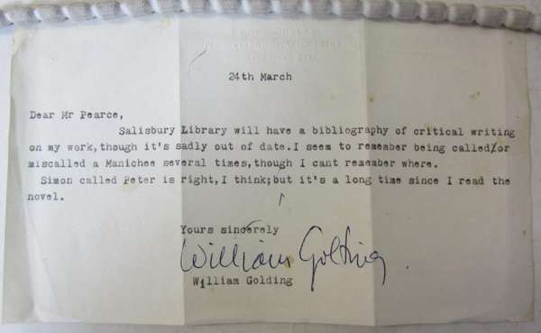 Note: Loosely inserted is a TLS signed by Golding to a Mr Pearce promising Salisbury Library a bibliography of the author's critical writings and referring to being miscalled a "Manichee several