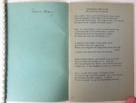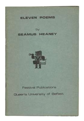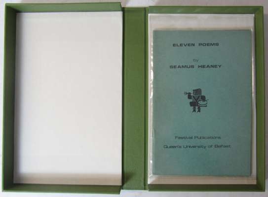 Eleven poems. Belfast: Festival Publications, Queens University of Belfast, [1966]. First edition, third issue with the herald with the drum device replacing the sun symbol, 8vo., publisher's green printed wrappers, signed by the author on the verso of the front cover, and contained in a green linen solander box