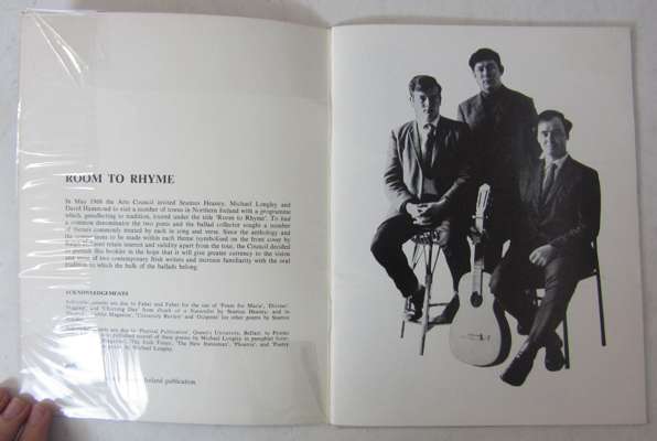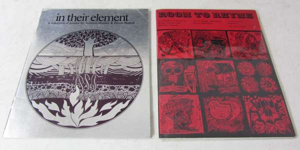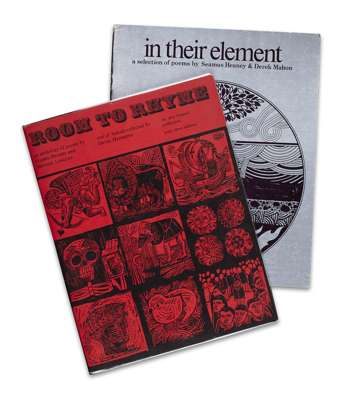 Room to rhyme: an anthology of poems by Seamus Heaney and Michael Longley and of ballads collected by David Hammond. [Belfast]: Arts Council of Northern Ireland, [1968]. First edition, small 4to., woodcut vignettes, red paper wrappers with the vignettes, lower wrapper slightly dusty (Brandes & Durkan B4); [Idem] In their element: a selection of poems. Belfast: Arts Council of Northern Ireland, [1977]. Small 4to., publisher's silver paper wrappers, edges slightly creased, signed by Heaney. (Brandes & Durkan B29) (2)