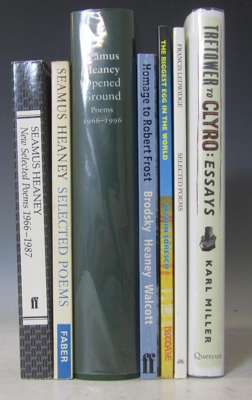 Selected poems 1965-1975. London: Faber and Faber, 1980. First edition in wrappers, 8vo., publisher's printed paper wrappers, wrappers very slightly dusty, inscribed by the author on the half title "Seamus Heaney March 1983 "Dig it" !" (Brandes & Durkan A26b); [Idem] New selected poems 1966-1987. London: Faber and Faber, 1990. First edition in wrappers, 8vo., publisher's printed wrappers, very slight wear at edges of covers. (Brandes & Durkan A46b); [Idem] Opened ground: poems 1966-1996. London: Faber and Faber, 1998. First edition, 8vo., publisher's green paper boards, dustwrapper, signed by the author on the titlepage. (Brandes & Durkan A70a); Marin Sorescu The Biggest egg in the world. Newcastle upon Tyne, 1987. 8vo., publisher's printed wrappers, signed by Sorescu on the half-title. (Brandes & Durksn B83); Francis Ledwidge Selected poems, introduced by Seamus Heaney. Dublin: New Island Books, 1992; with Brodsky, Joseph and Walcott, Derek Homage to Robert Frost. London: Faber and Faber, 1997. First English edition, 8vo., publisher's printed wrappers. (Brandes & Durkan B165b); Karl Miller Tretower to Clyro: essays. London: Quercus, 2011. First edition, 8vo., publisher's cloth, dustwrappers, signed by Karl Miller, Seamus Heaney and Andrew O'Hagan on the titlepage (7)