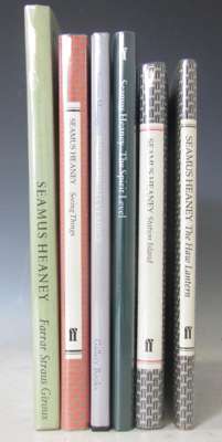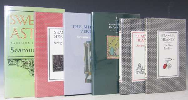Sweeney astray: a version from the Irish. New York: Farrar, Straus, Giroux, 1983. First American edition, 8vo., publisher's quarter bown cloth, green paper boards, signed by the author on the titlepage (Brandes & Durkan A34c); [Idem] Station Island. London: Faber and Faber, 1984. First edition, small 8vo., publisher's black cloth, dustwrappers, signed by the author on the half-title (Brandes & Durkan A36a); [Idem] The haw lantern. London: Faber and Faber, 1987. First edition, small 8vo., publisher's red cloth boards, dustwrappers, signed by the author on the front free endpaper (Brandes & Durkan A41a); [Idem] Seeing things. London: Faber and Faber, 1991. First edition, 8vo., publisher's grey cloth, dustwrappers, signed by the author on the titlepage (Brandes & Durkan A50a); [Idem] The midnight verdict. Oldcastle: Gallery Books, 1993. First edition, publisher's black cloth, dustwrappers, signed by the author on the titlepage (Brandes & Durkan A55a); [Idem] The spirit level. London: Faber and Faber, 1996. First edition, 8vo., publisher's green cloth, dustwrappers, signed by the author on the titlepage (Brandes & Durkan A65a) (6)