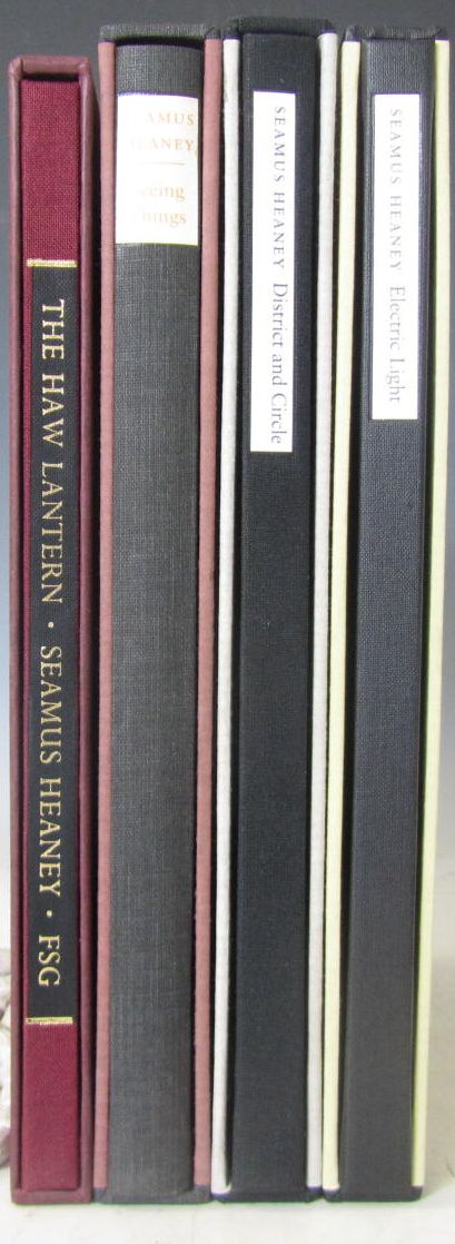 The Haw lantern. New York: Farrar, Straus, Giroux, 1987. First edition, 8vo., publisher's dark red cloth, in wine coloured paper slip case, no. 163 of 250 signed by the author (Brandes & Durkan A41e); [Idem] Seeing things. London: Faber and Faber, 1991. First edition, 8vo., publisher's rust coloured cloth, printed paper label, in a matching slip case, no. 24 of 250 signed by the author (Brandes & Durkan A50c); [Idem] Electric light. London: Faber and Faber, 2001. First edition, 8vo., publisher's cream coloured paper boards, printed paper label, in a matching slip case, no. 31 of 325 copies signed by the author (Brandes & Durjan A75c); [Idem] District and circle. London: Faber and Faber, 2006. First edition, publisher's quarter black cloth, quarter cloth, paper boards, printed paper label, in a matching slip case, no. 298 of 325 signed by the author (4)